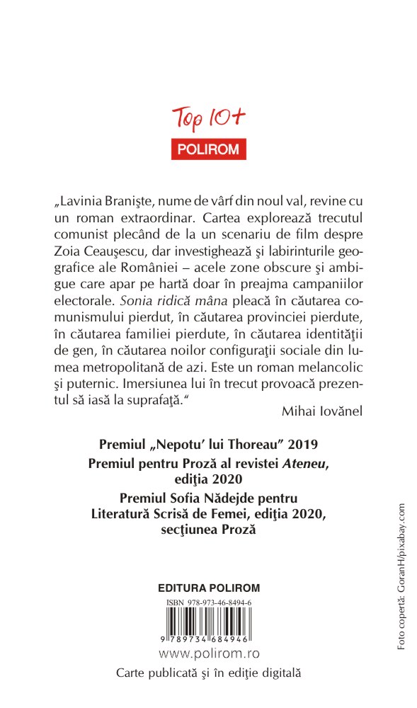 „Lavinia Branişte, nume de vîrf din noul val, revine cu un roman extraordinar. Cartea explorează trecutul comunist plecînd de la un scenariu de film despre Zoia Ceauşescu, dar investighează şi labirinturile geografice ale României – acele zone obscure şi ambigue care apar pe hartă doar în preajma campaniilor electorale. Sonia ridică mâna pleacă în căutarea comunismului pierdut, în căutarea provinciei pierdute, în căutarea familiei pierdute, în căutarea identităţii de gen, în căutarea noilor configuraţii sociale din lumea metropolitană de azi. Este un roman melancolic şi puternic. Imersiunea lui în trecut provoacă prezentul să iasă la suprafaţă.” (Mihai Iovănel)