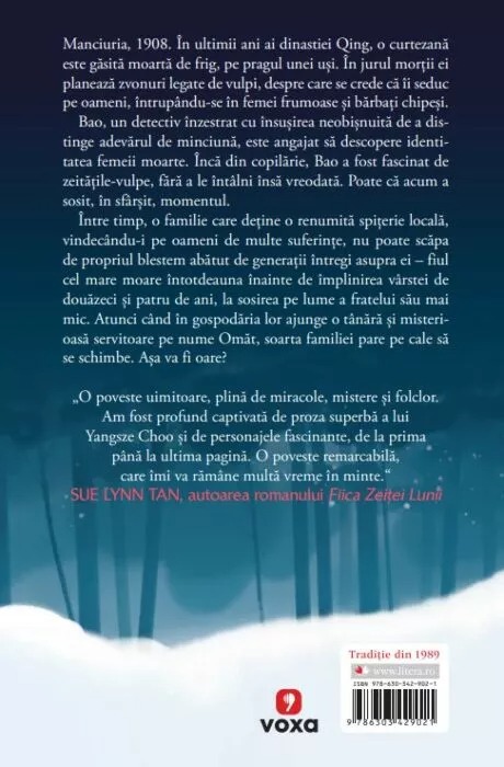 YANGSZE CHOO este autoarea bestsellerelor New York Times Mireasa fantomă (The Ghost Bride, ecranizat de Netflix) și Tigrul nopții (The Night Tiger), roman ce a figurat pe lista Reese’s Book Club și a fost selecționat ca Big Jubilee Read în cadrul Jubileului de Platină al reginei Elisabeta a II-a. Trăiește în California, alături de familia sa, și îi place nespus să mănânce și să citească (adesea în același timp). Nici Soția-vulpe (The Fox Wife), nici celelalte romane ale sale nu ar fi fost posibile fără cantități uriașe de ciocolată neagră.