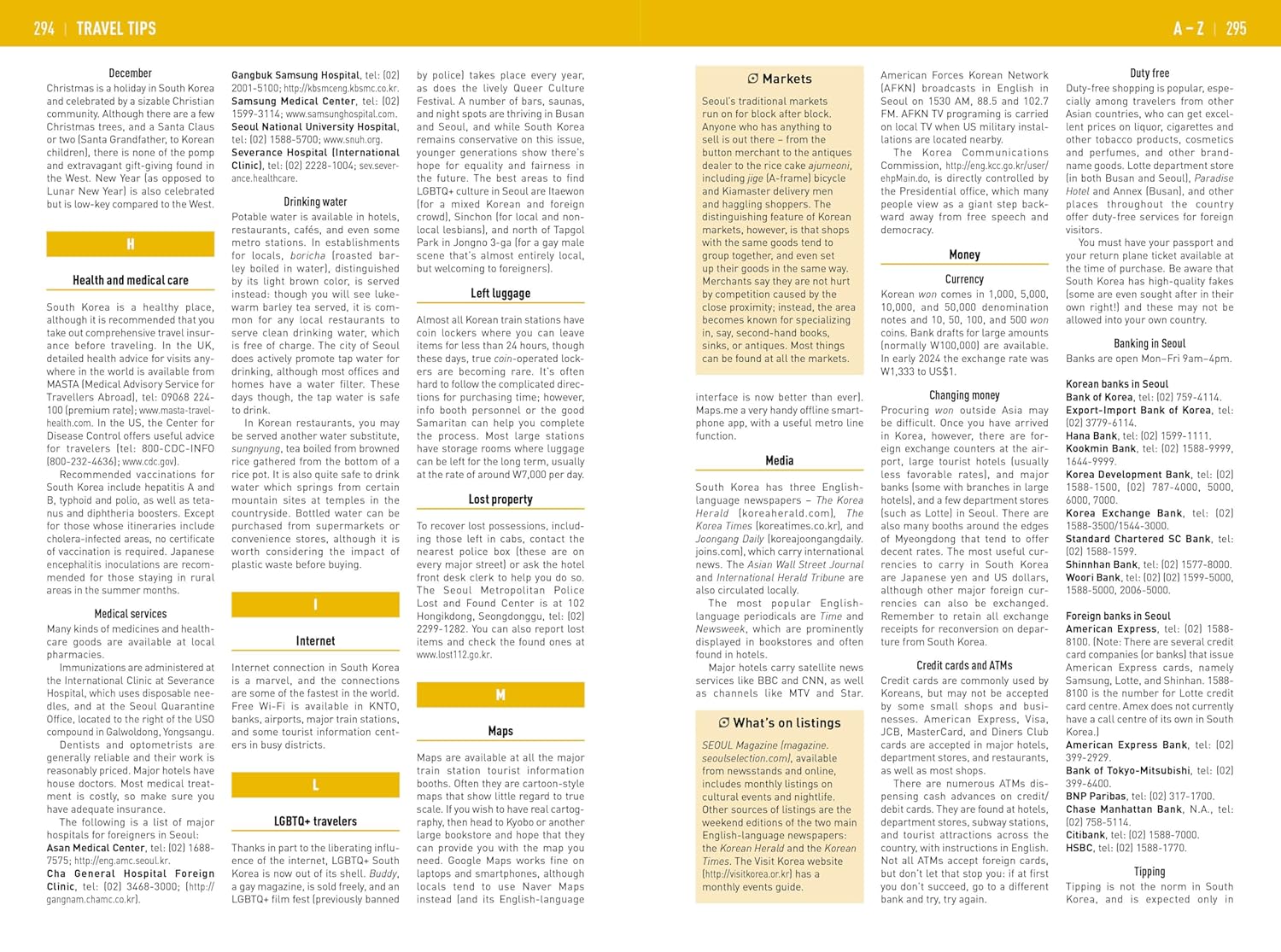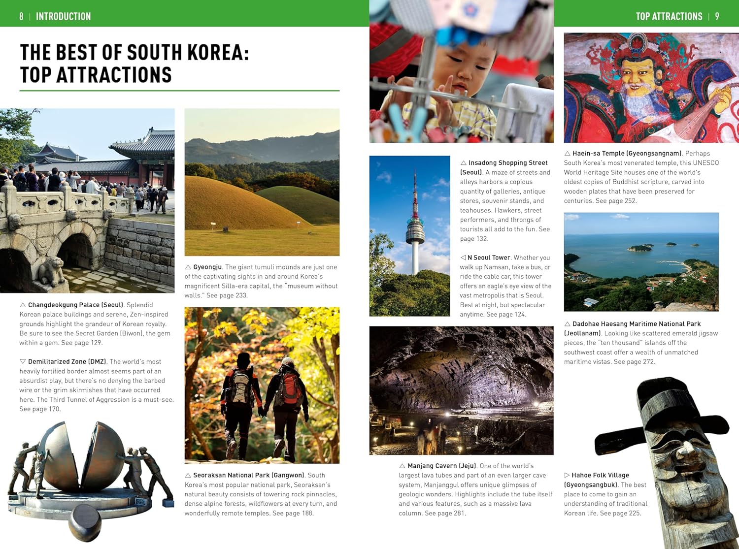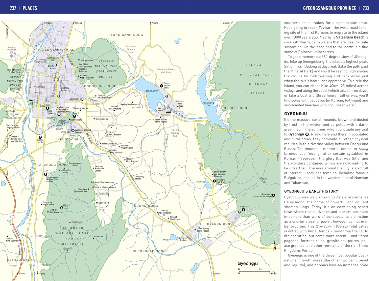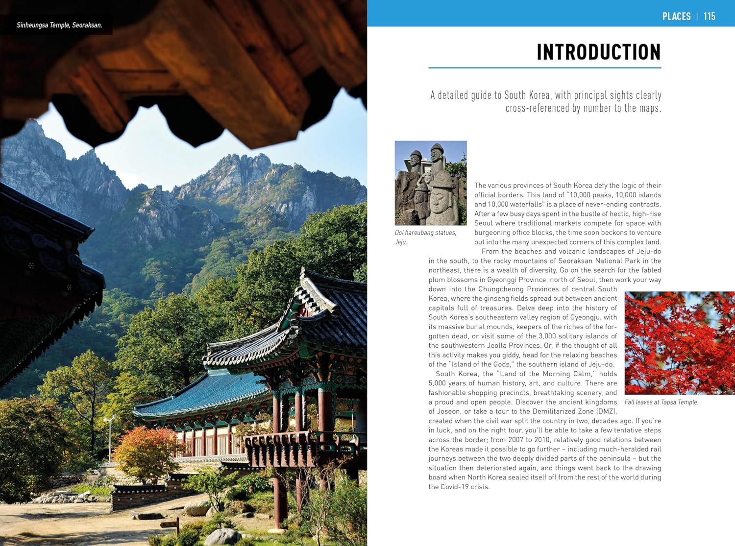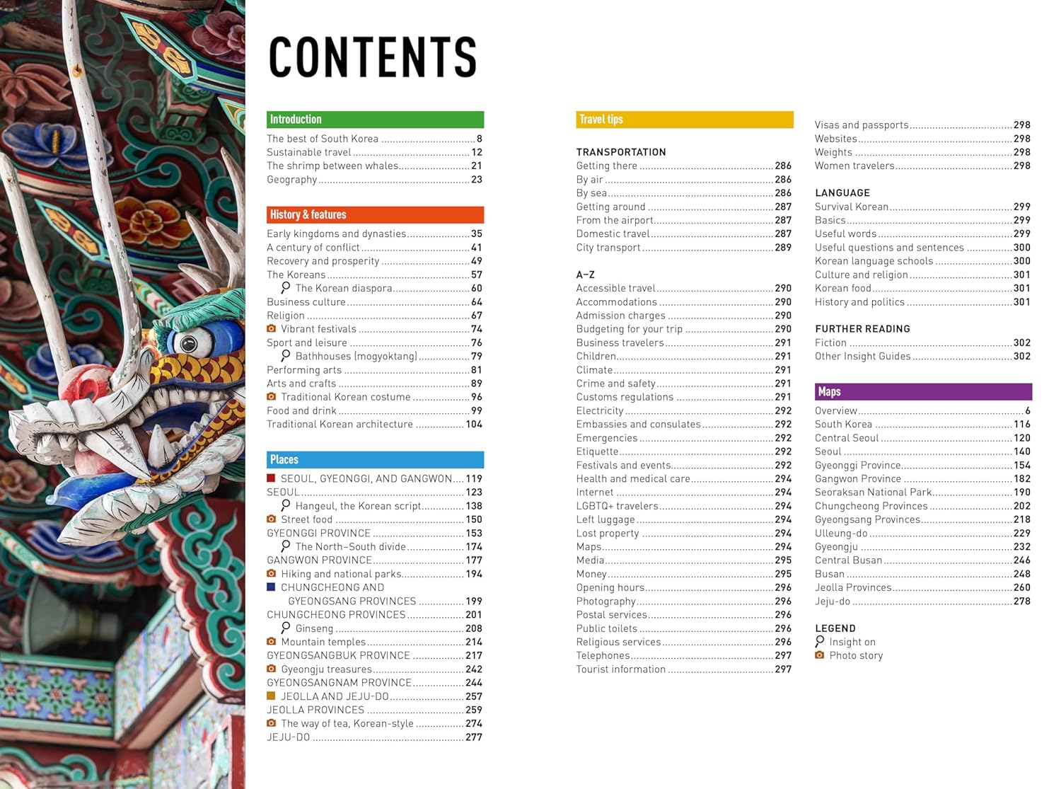 This South Korea guidebook covers: Seoul, Gyeonggi, and Gangwon, Gyeonggi Province, Gangwon Province, Chungcheong Provinces, Gyeongsangbuk Province, Gyeongsangnam Province, Jeolla and Jeju-do.
