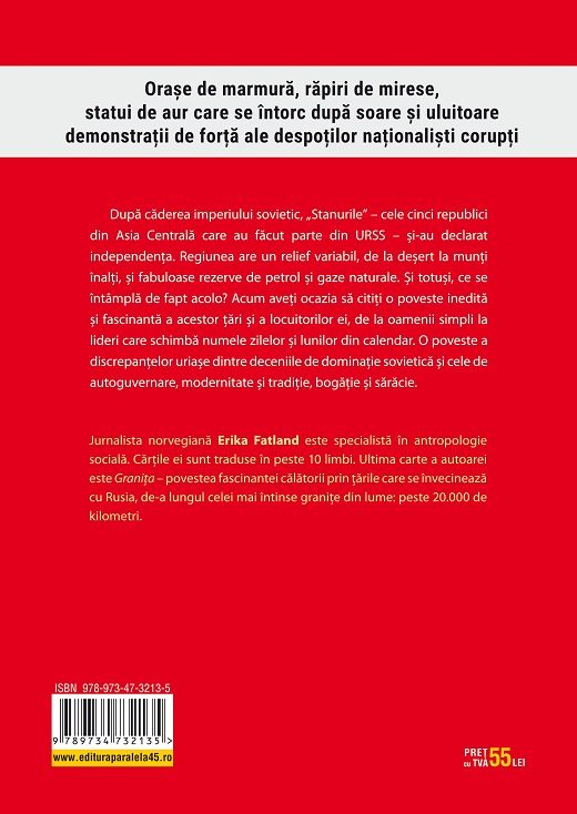 După căderea imperiului sovietic, „Stanurile” – cele cinci republici din Asia Centrală care au făcut parte din URSS – și-au declarat independența. Regiunea are un relief variabil, de la deșert la munți înalți, și fabuloase rezerve de petrol și gaze naturale. Și totuși, ce se întâmplă de fapt acolo? Acum aveți ocazia să citiți o poveste inedită și fascinantă a acestor țări și a locuitorilor ei, de la oamenii simpli la lideri care schimbă numele zilelor și lunilor din calendar. O poveste a discrepanțelor uriașe dintre deceniile de dominație sovietică și cele de autoguvernare, modernitate și tradiție, bogăție și sărăcie.