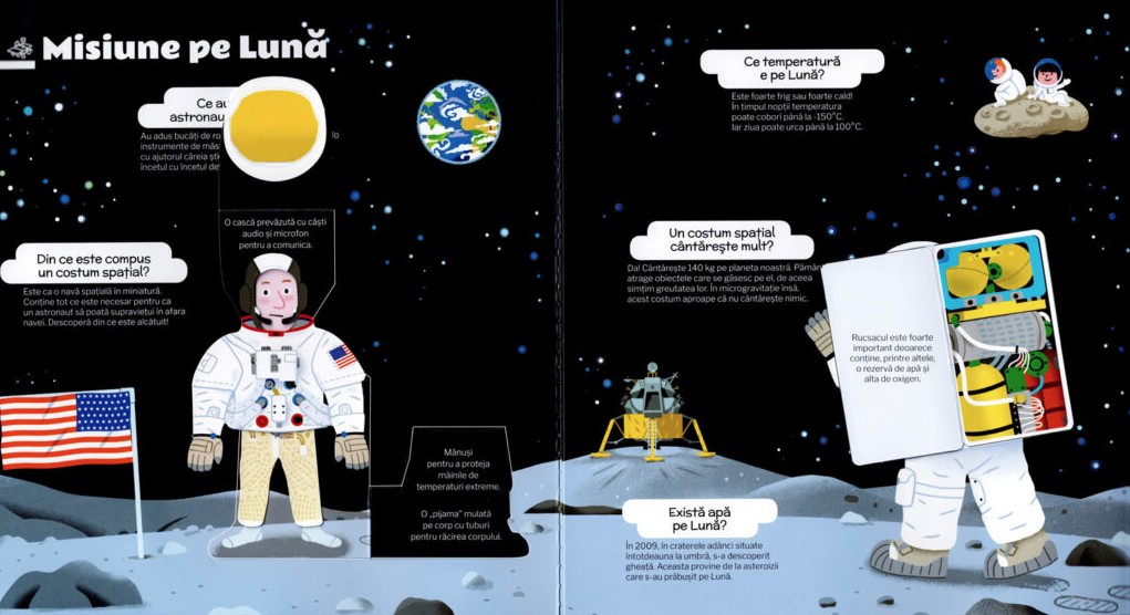 Volumul răspunde la peste 85 de întrebări despre Univers, oferind copiilor o experiență unică de a învăța tot ce trebuie să știe despre spațiul cosmic. Autorii au ales să folosească termeni științifici reali și informații de ultimă actualitate (precum misiunile pe Lună și Marte), demonstrând că iau în serios curiozitatea copiilor!