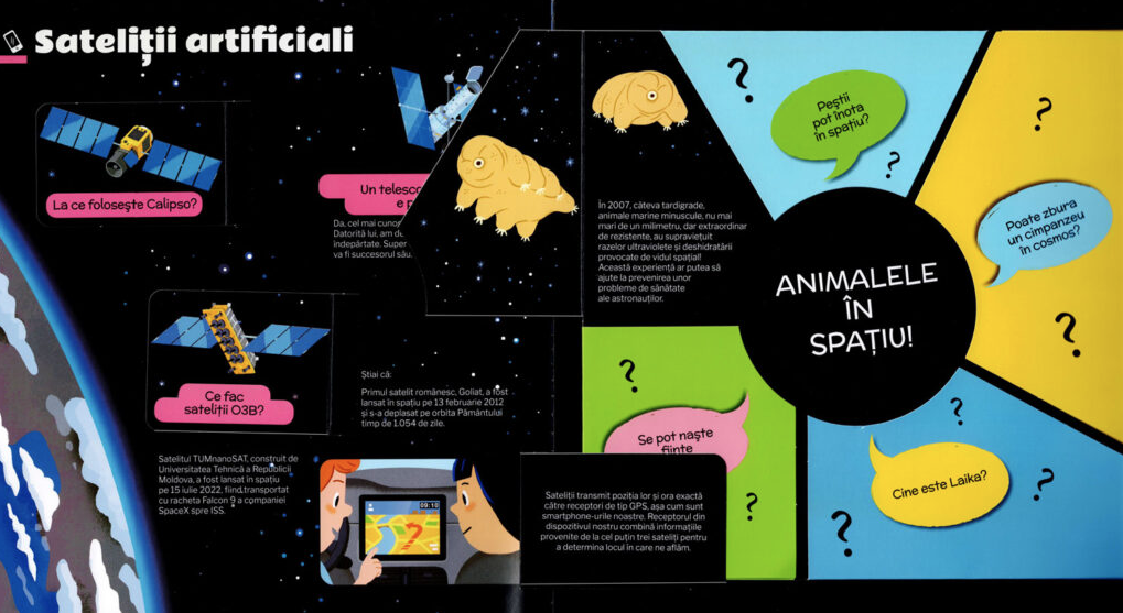 • Misterele Lunii: Aflați secretele satelitului nostru natural pe o pagină triplă pliantă.