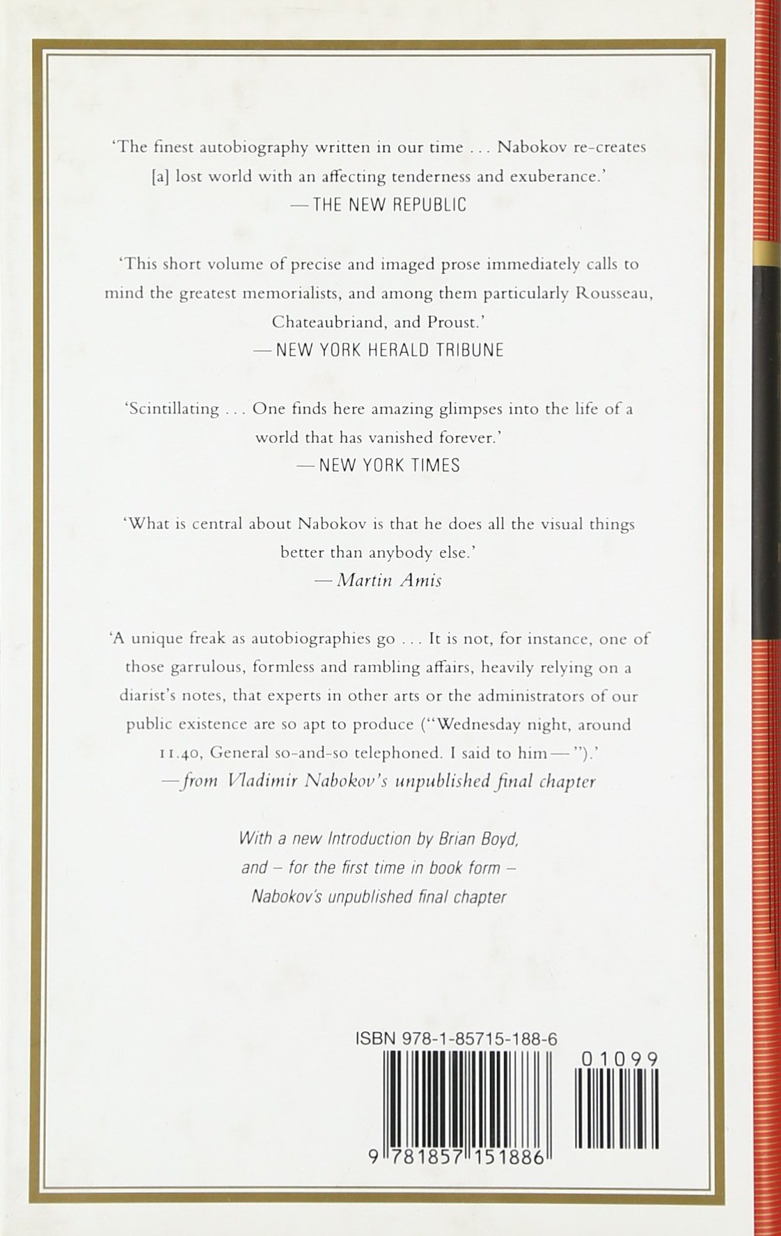 An autobiographical volume which recounts the story of Nabokov's first forty years up to his departure from Europe for America at the outset of World War Two. It tells of his emergence as a writer, his early loves and his marriage, and his passions for butterflies and his lost homeland. Written in this writer's characteristically brilliant, mordant style, this book is also a tender record of lost childhood and youth in pre-Revolutionary Russia.