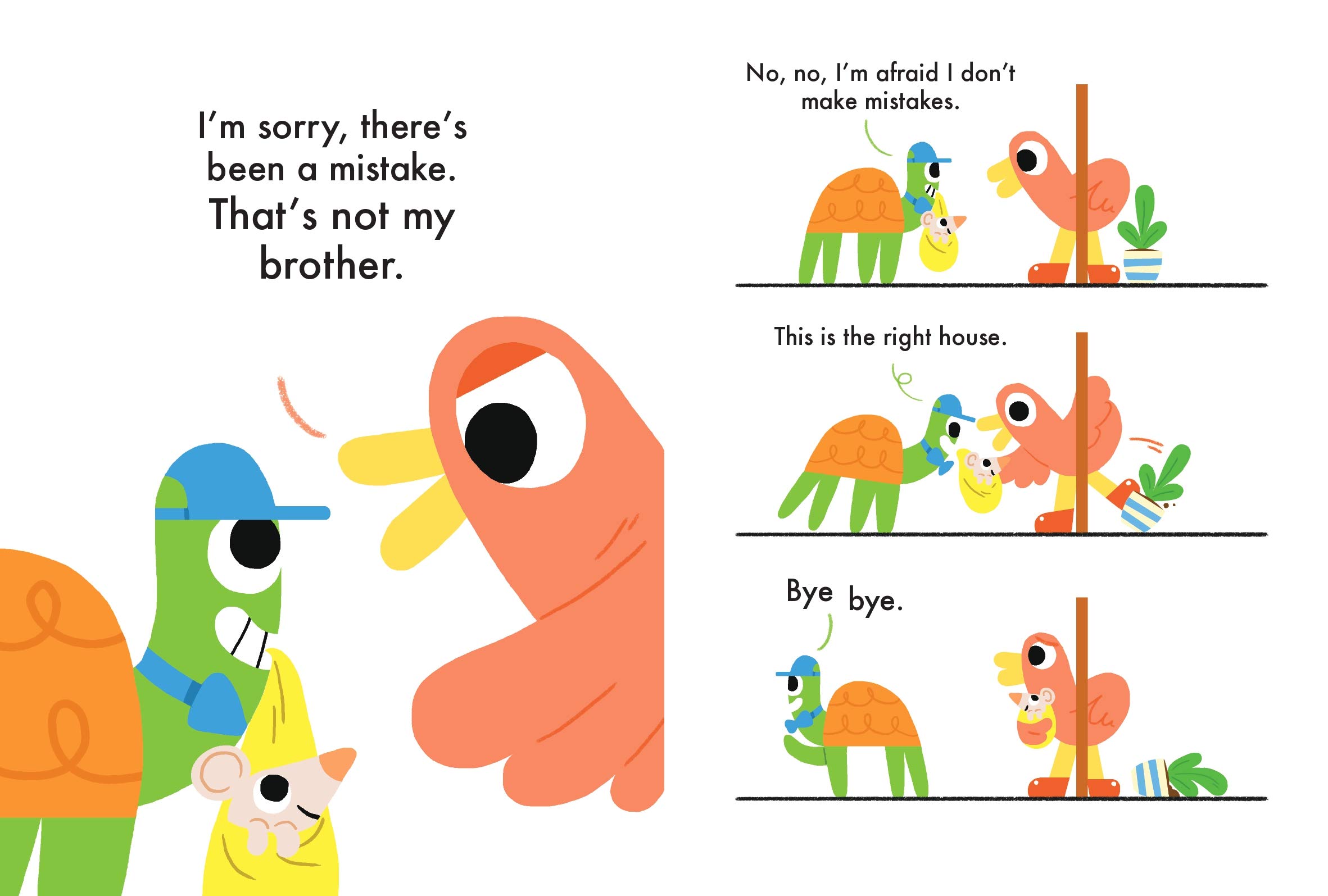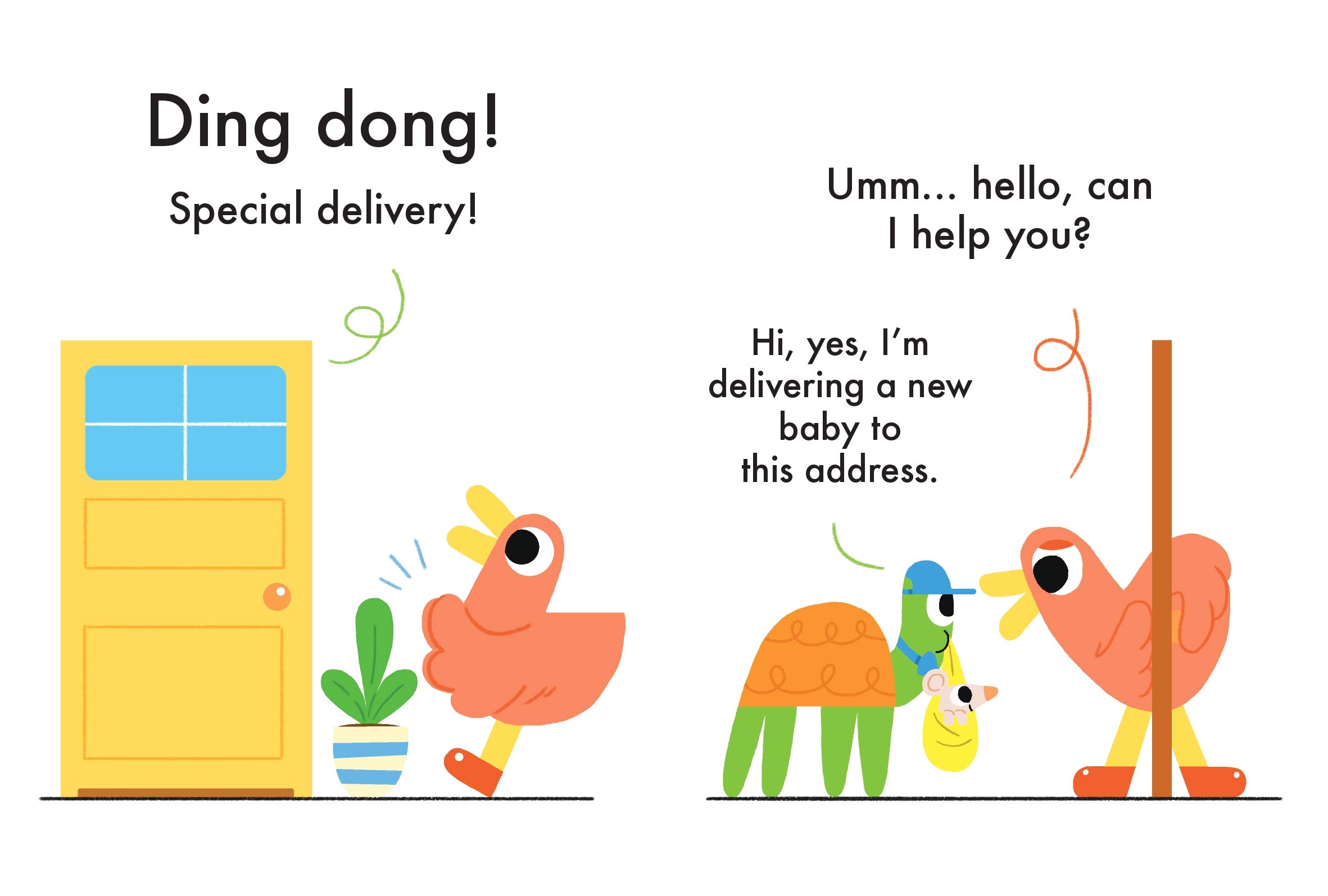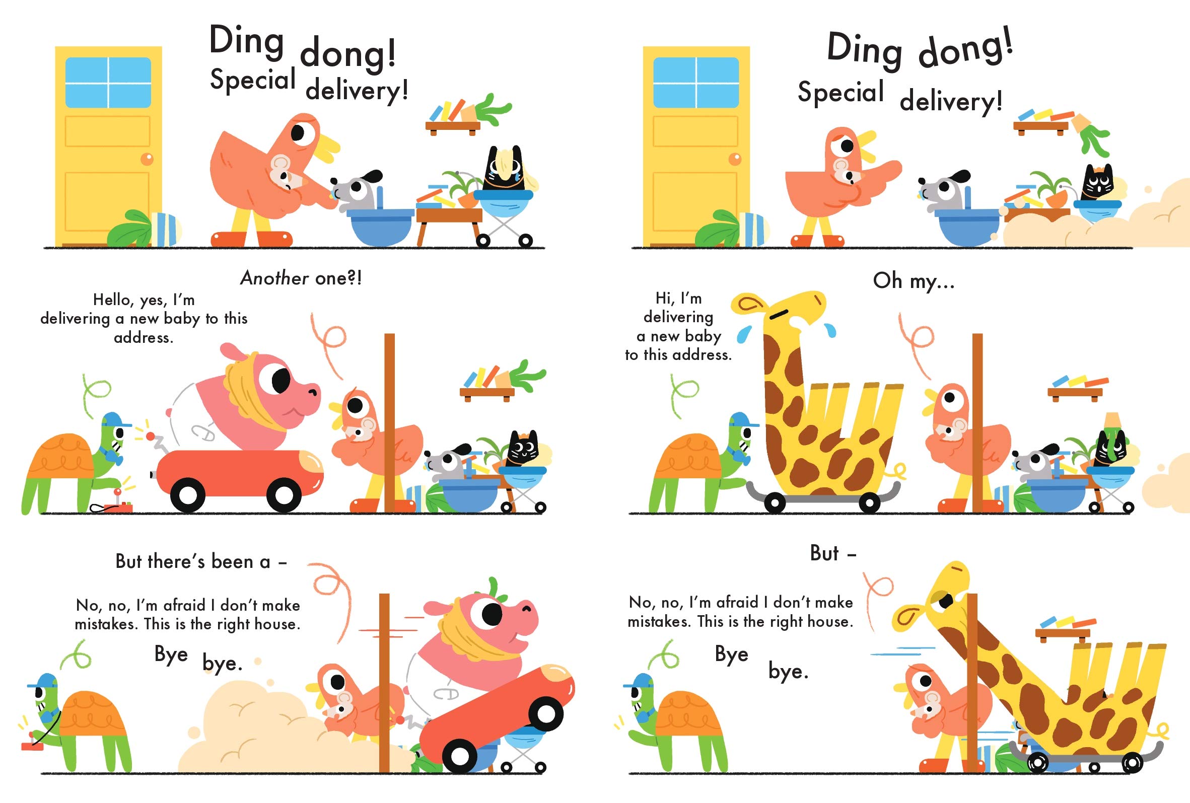 But Delivery Dude keeps bringing the wrong babies. First a baby mouse, then a baby elephant, then a crocodile, a giraffe, an anteat-er a rabbit and a hippo. ‘These babies are NOT my brother!’ shouts Sophie – but Delivery Dude insists that he never makes mistakes. Sophie’s house is filling up to the rafters when the doorbell rings again. ‘NO MORE!’ shouts Sophie, but thankfully this time Delivery Dude is followed by his Stork boss, a load of very cross parents who have come to collect their babies... and Sophie’s Mum and Dad, who have brought a very special delivery... .