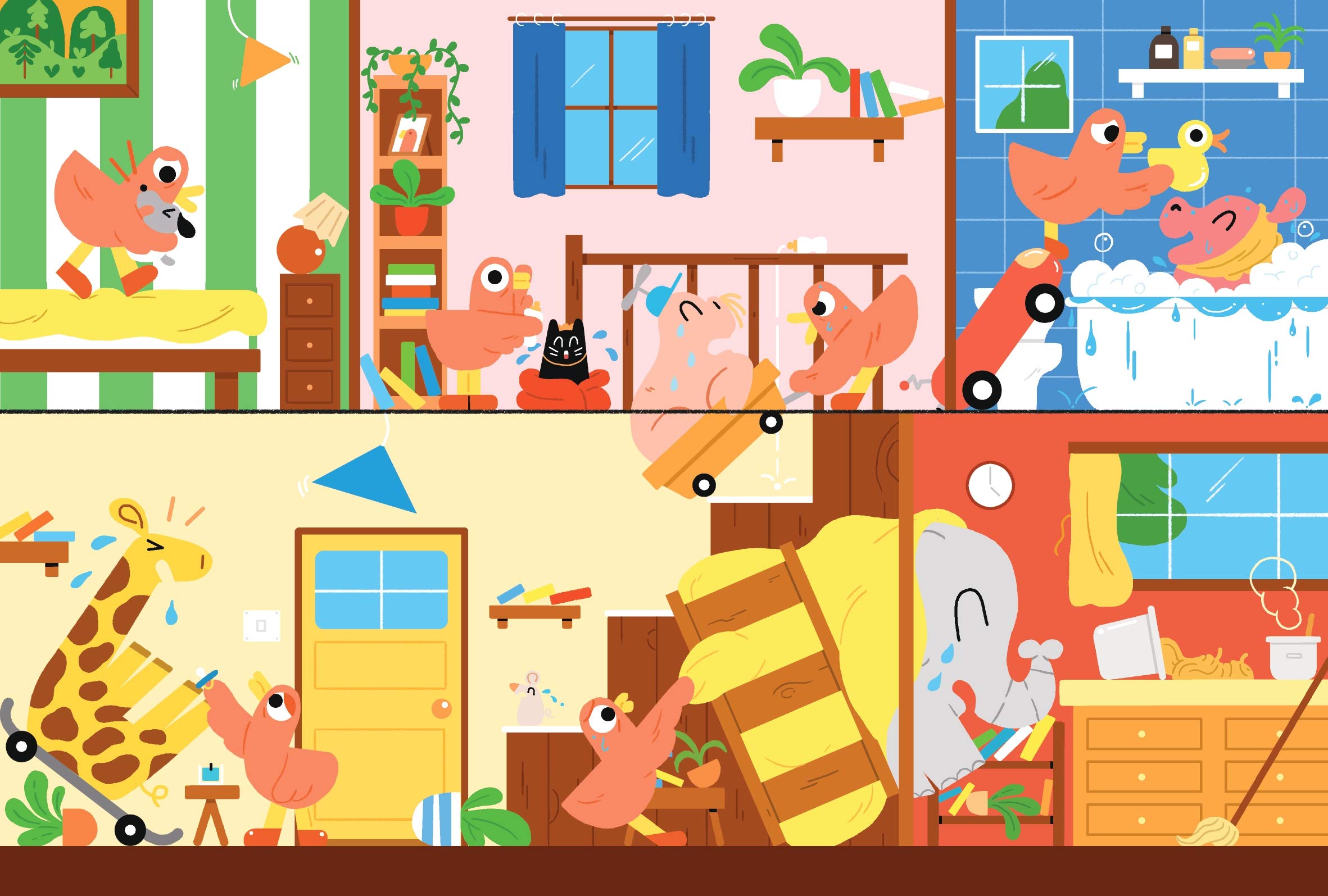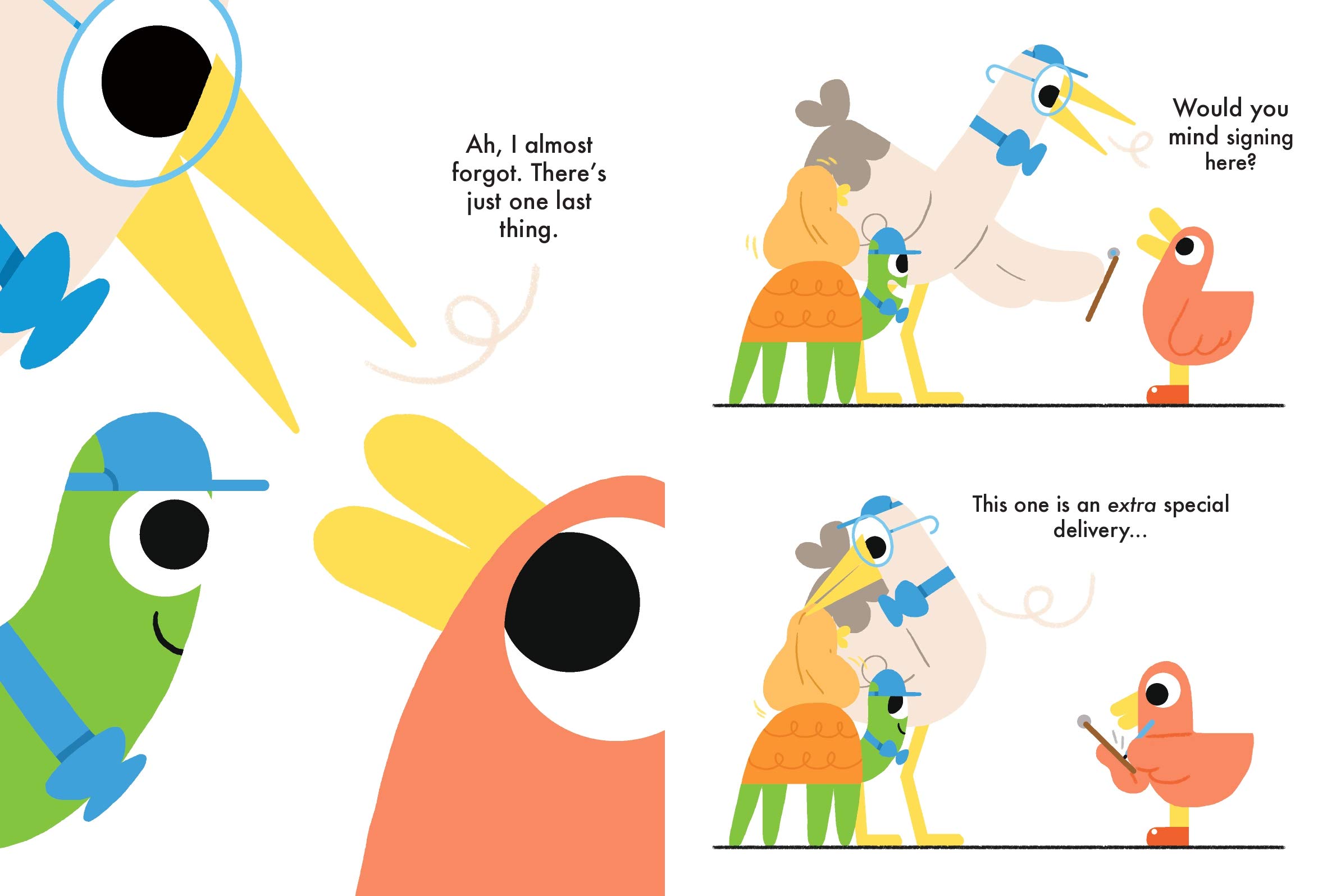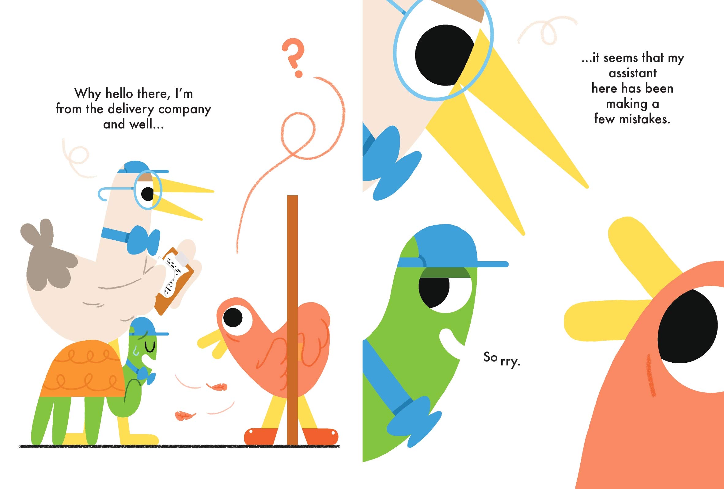 But Delivery Dude keeps bringing the wrong babies. First a baby mouse, then a baby elephant, then a crocodile, a giraffe, an anteat-er a rabbit and a hippo. ‘These babies are NOT my brother!’ shouts Sophie – but Delivery Dude insists that he never makes mistakes. Sophie’s house is filling up to the rafters when the doorbell rings again. ‘NO MORE!’ shouts Sophie, but thankfully this time Delivery Dude is followed by his Stork boss, a load of very cross parents who have come to collect their babies... and Sophie’s Mum and Dad, who have brought a very special delivery... .