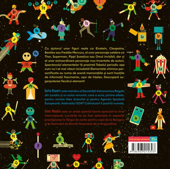 Spectacolul elementelor îți prezintă Tabelul periodic așa cum nu l-ai mai văzut niciodată, elementele chimice fiind personificate şi prezentate în stilul inconfundabil al artistului Ximo Abadía. Textele însoţitoare şi glosarul final conţin informaţii captivante, prin care fiecare element îşi dezvăluie povestea, proprietăţile şi utilitatea într-un mod simplu şi uşor de reţinut, împrietenindu-i pe micii cititori cu lumea fascinantă a chimiei.