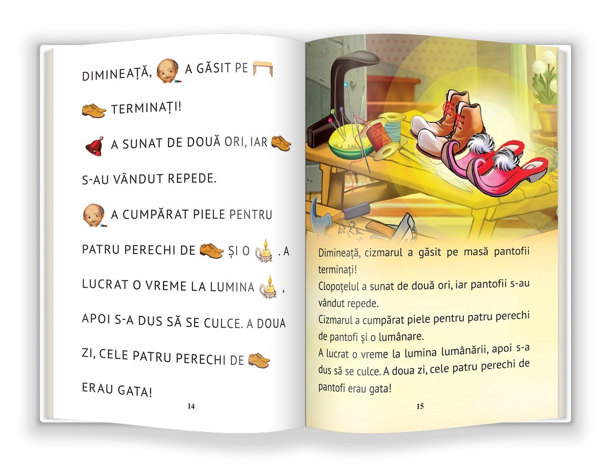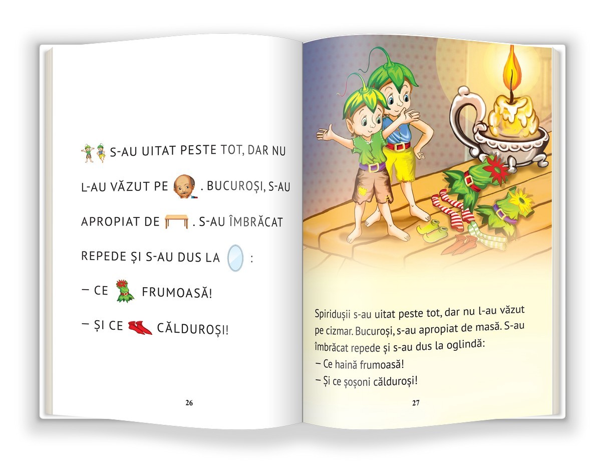 Spiridușii cizmari este povestea unui bătrân pantofar, pe care Crăciunul amenința să-l găsească sărac. Copilul va descoperi cum l-au ajutat spiridușii misterioși să ducă un trai îmbelșugat, în timp ce citește primele cuvinte singur.