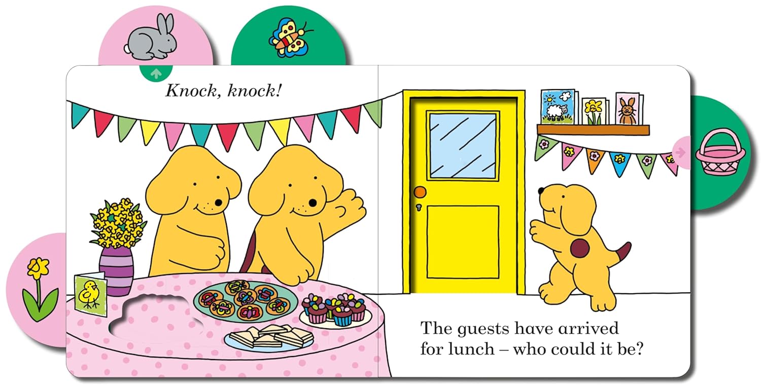 Toddlers will love pulling the tabs to help him make Easter crafts, do some yummy baking, and join in on an Easter egg hunt, before his special guests arrive - Grandma and Grandpa!