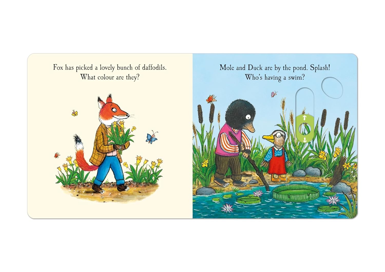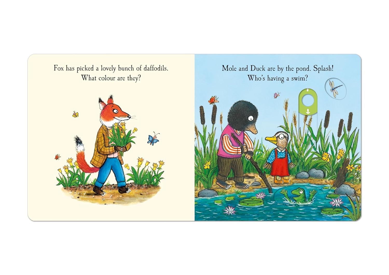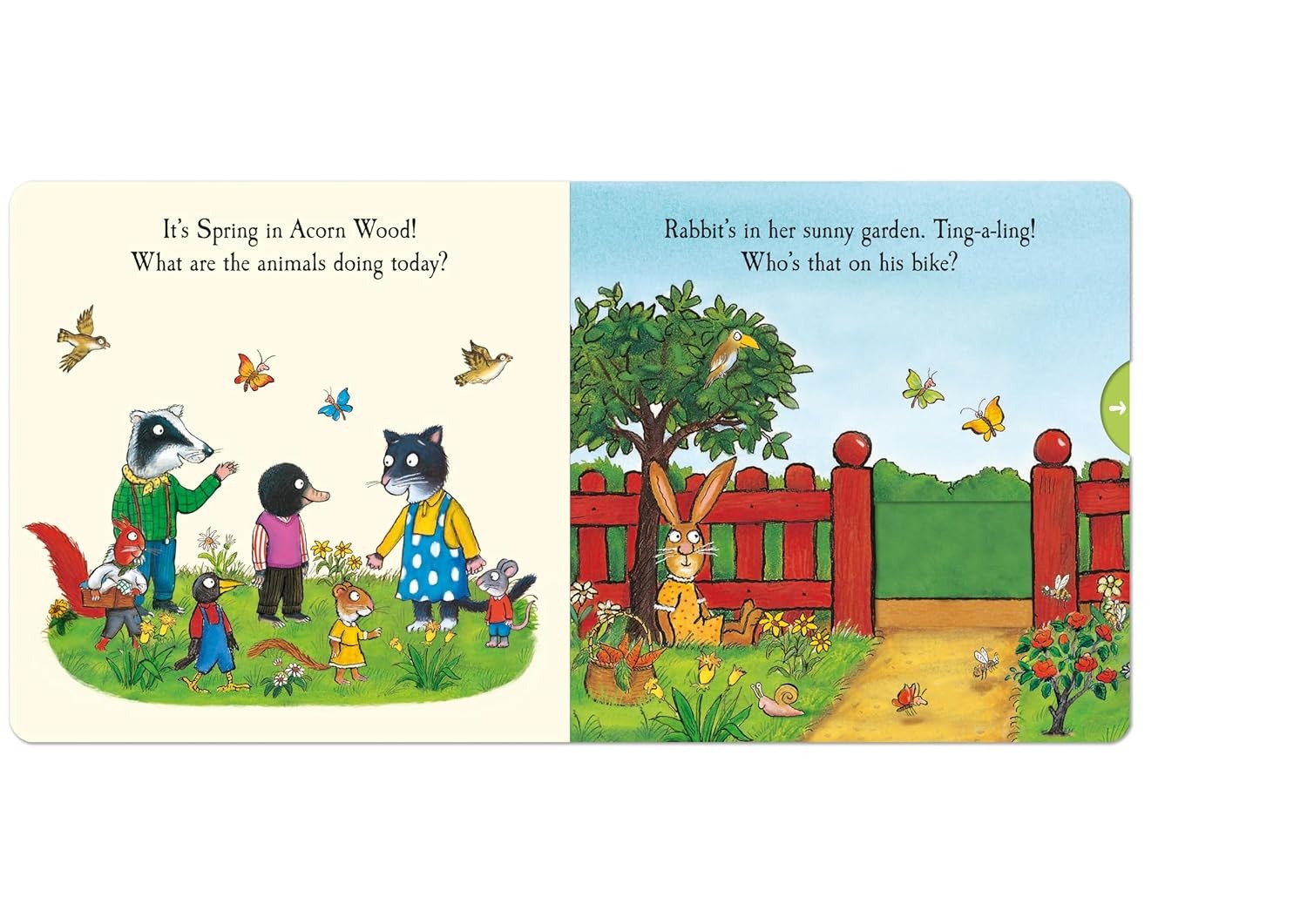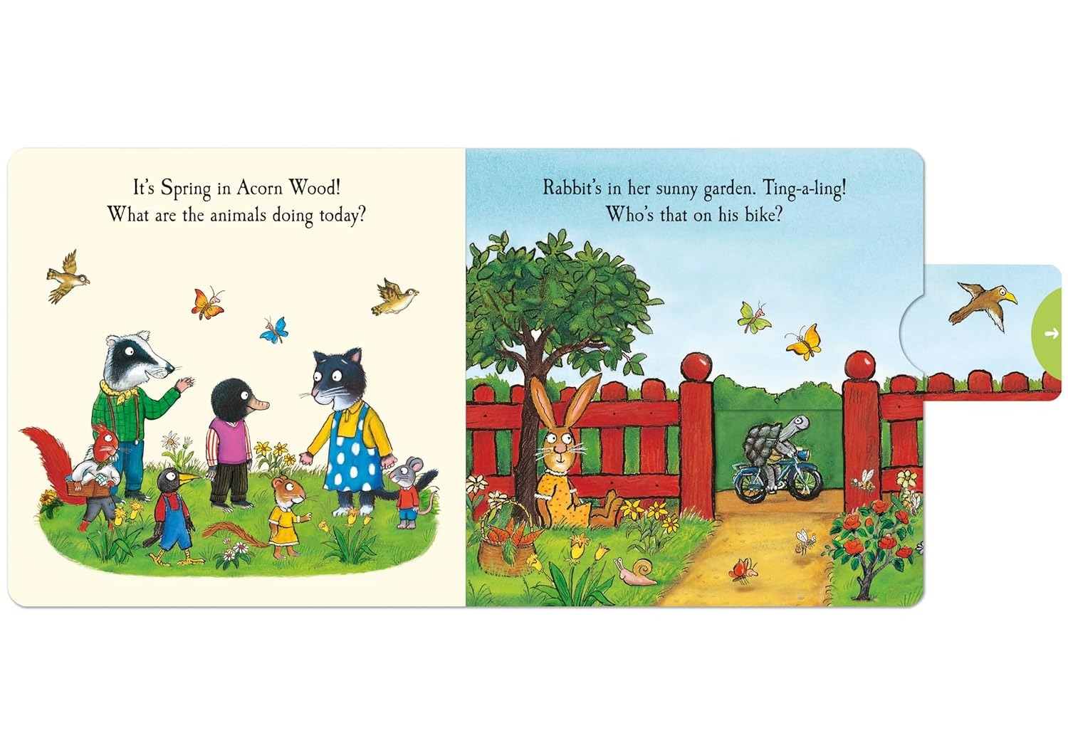 How are Rabbit, Cat, Hen and all their animal friends celebrating the Spring? Push, pull and slide the tabs to find out! Join Tortoise on a sunny bike ride, help Fox pick a lovely bunch of daffodils and enjoy a fun picnic in the meadow with Pig, Badger and friends.