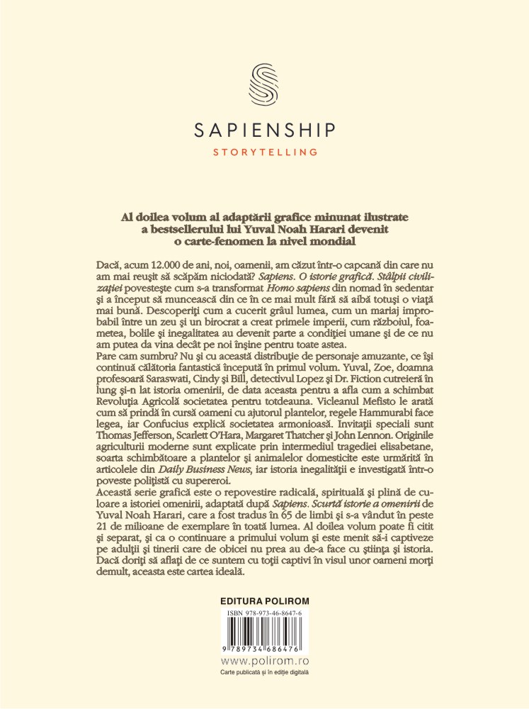Această serie grafică este o repovestire radicală, spirituală și plină de culoare a istoriei omenirii, adaptată după Sapiens. Scurtă istorie a omenirii de Yuval Noah Harari, care a fost tradus în 65 de limbi și s-a vândut în peste 21 de milioane de exemplare în toată lumea. Al doilea volum poate fi citit și separat, și ca o continuare a primului volum și este menit să-i captiveze pe adulții și tinerii care de obicei nu prea au de-a face cu știința și istoria.