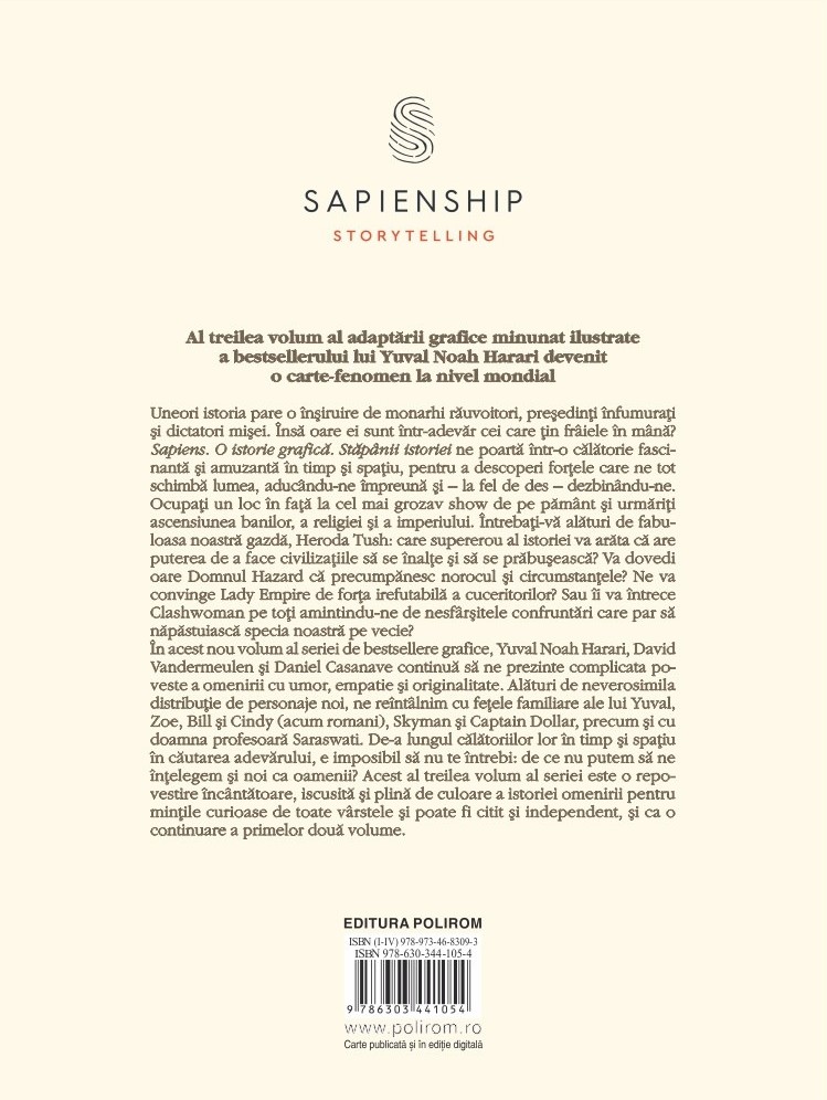 Sapiens. O istorie grafică. Stăpânii istoriei ne poartă într-o călătorie fascinantă și amuzantă în timp și spațiu, pentru a descoperi forțele care ne tot schimbă lumea, aducându-ne împreună și – la fel de des – dezbinându-ne.