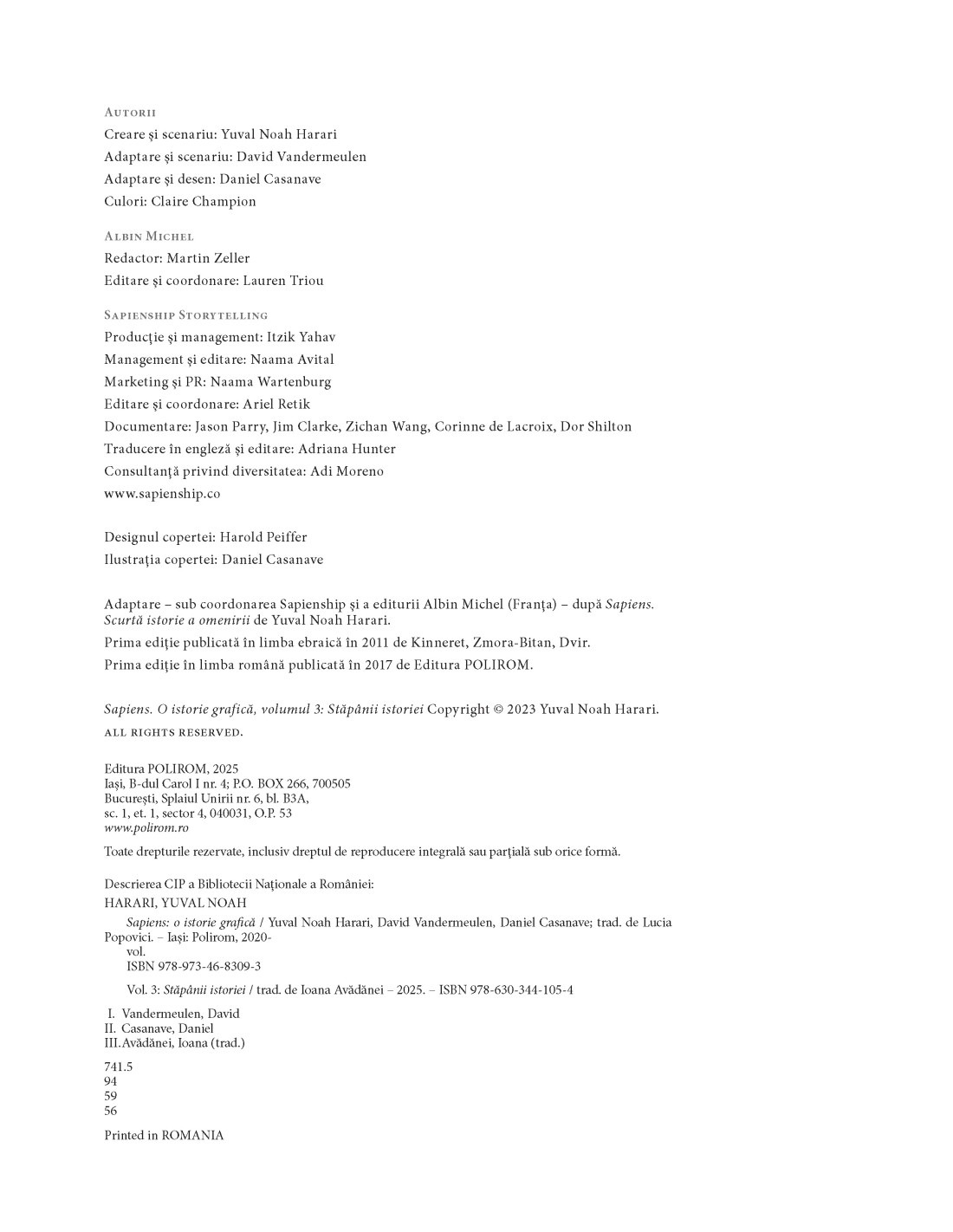 În acest nou volum al seriei de bestsellere grafice, Yuval Noah Harari, David Vandermeulen și Daniel Casanave continuă să ne prezinte complicata poveste a omenirii cu umor, empatie și originalitate. Alături de neverosimila distribuție de personaje noi, ne reîntâlnim cu fețele familiare ale lui Yuval, Zoe, Bill și Cindy (acum romani), Skyman și Captain Dollar, precum și cu doamna profesoară Saraswati.