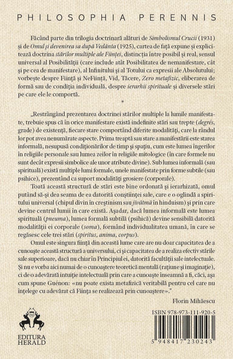 Facand parte din trilogia doctrinara alaturi de Simbolismul Crucii (1931) si de Omul si devenirea sa dupa Vedanta (1925), cartea de fata expune si expliciteaza doctrina starilor multiple ale Fiintei, distinctia intre posibil si real, sensul universal al Posibilitatii (care include atat Posibilitatea de nemanifestare, cat si pe cea de manifestare), al Infinitului si al Totului ca expresii ale Absolutului; vorbeste despre Fiinta si NeFiinta, Vid, Tacere, Zero metafizic, eliberarea de forma sau de conditia individuala, despre ierarhii spirituale si diversele stari pe care ele le comporta