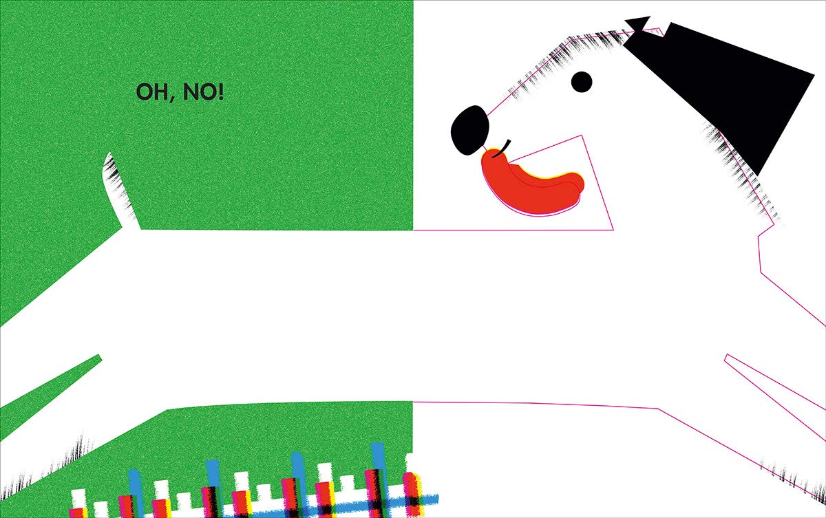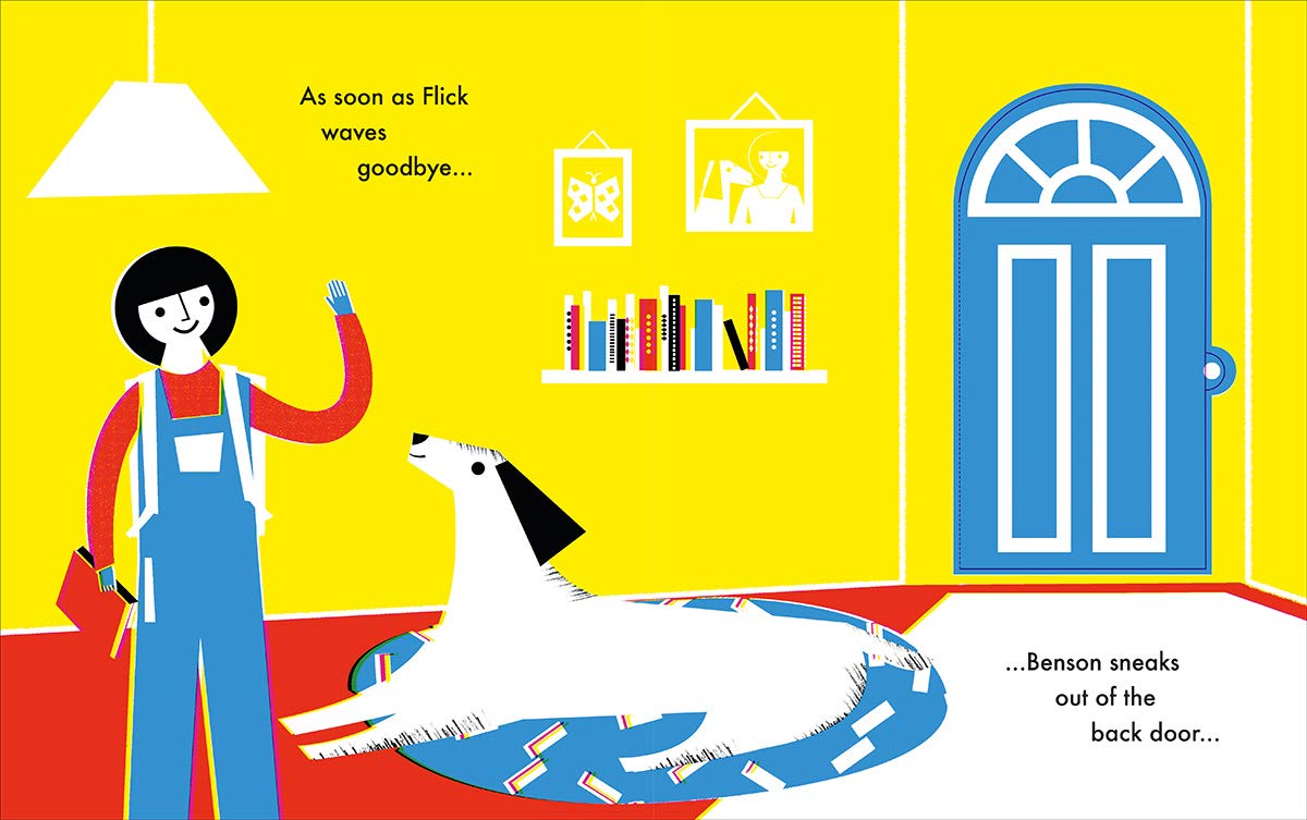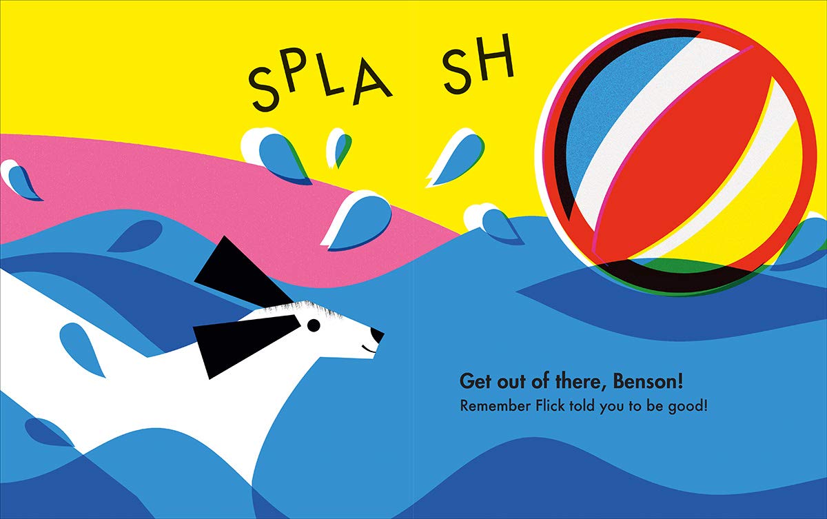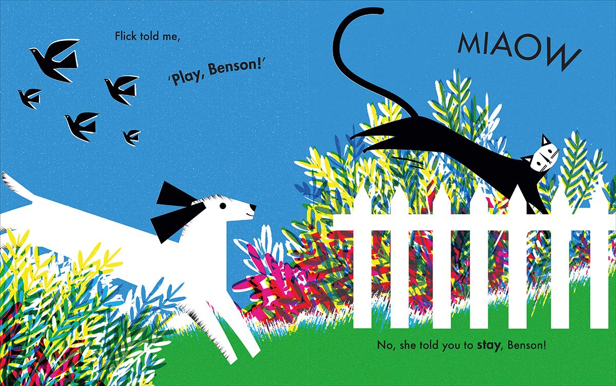 Flick’s dog Benson is a very good boy. He waits for her at home and he never chases anything... or so Flick thinks. One day, when Flick leaves for school, Benson chases a cat into the back garden, over the fence and into the park, where he chases a squirrel. A ball catches his eye and he follows it into the pond – and then he runs, dripping wet, through the middle of a picnic lunch, stealing a sausage! The picnickers shout ‘GO HOME BENSON’, and he races back across town, hopping through the window to his house just as Flick arrives home from school. ‘Have you been a good boy, Benson? Did you stay?’ Only the reader really knows what Benson, the naughty dog, has been doing all day.