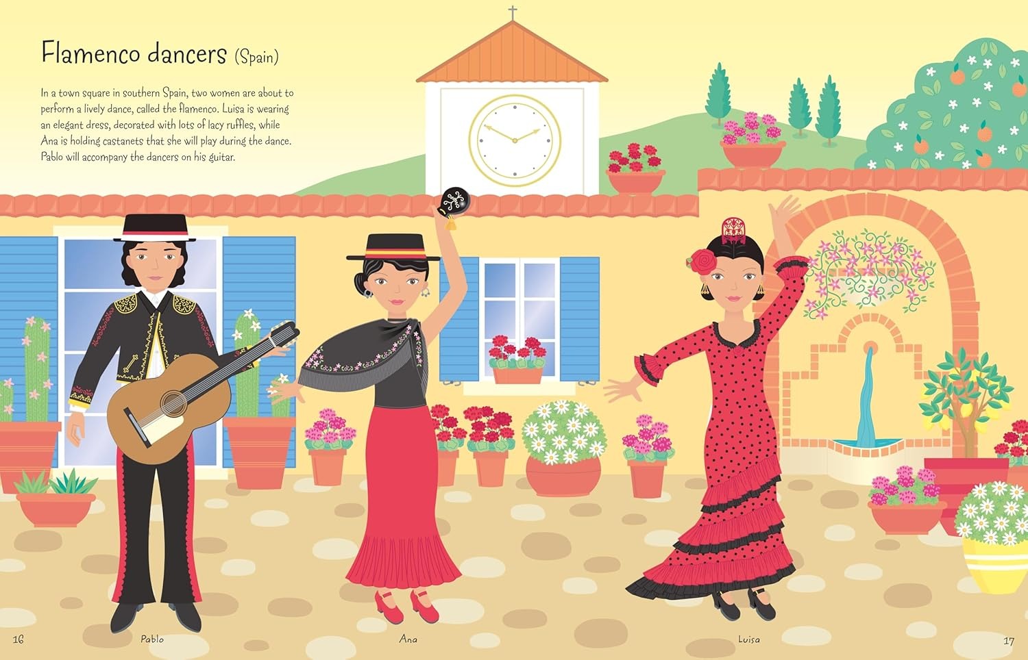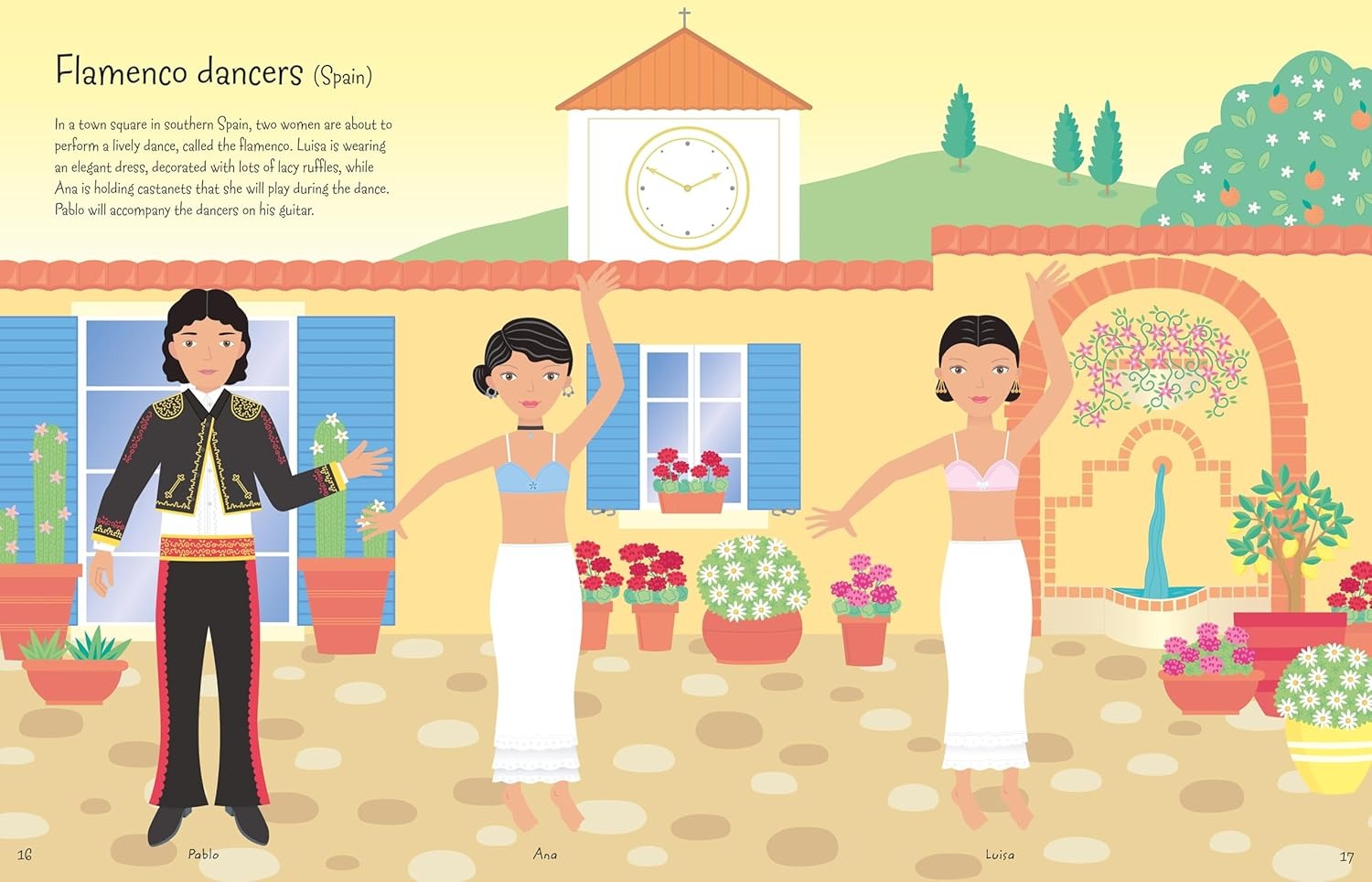 Dress the girl and boy dolls in wonderful traditional costumes for festivals and ceremonies around the world, including beautiful silk saris at an Indian wedding, fabulous flamenco dresses in Spain, a Mexican carnival and harvest festival in Tibet.