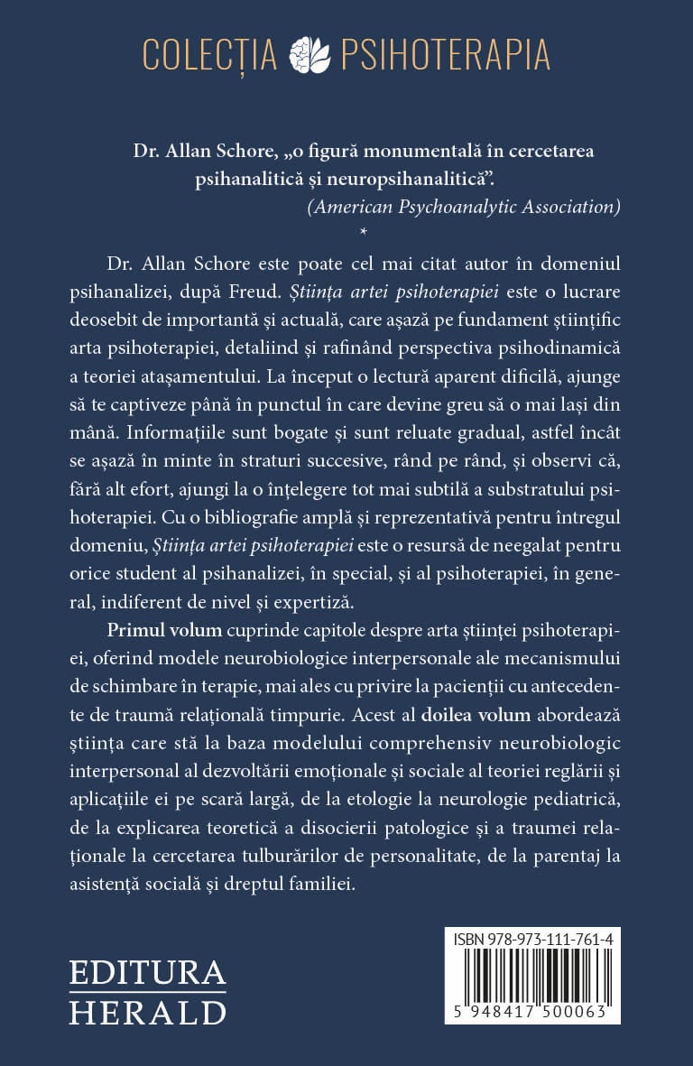 Allan Schore este poate cel mai citat autor in domeniul psihanalizei, dupa Freud. Stiinta artei psihoterapiei este o lucrare deosebit de importanta si actuala, care creeaza un fundament stiintific pentru arta psihoterapiei, detaliind si rafinand perspectiva psihodinamica a teoriei atasamentului. La inceput o lectura aparent dificila, ajunge sa te captiveze pana in punctul in care devine greu sa o mai lasi din mana. Informatiile sunt bogate si sunt reluate gradual, astfel incat se asaza in minte in straturi succesive, rand pe rand, si observi ca, fara alt efort, ajungi la o intelegere tot mai subtila a substratului psihoterapiei. Cu o bibliografie ampla si reprezentativa pentru intregul domeniu, Stiinta artei psihoterapiei este o resursa de neegalat pentru orice student al psihanalizei, in special, si al psihoterapiei, in general, indiferent de nivel si expertiza. Acest prim volum cuprinde capitole despre stiinta psihoterapiei, oferind modele neurobiologice interpersonale ale mecanismului de schimbare in terapie, mai ales cu privire la pacientii cu antecedente de trauma relationala timpurie. Al doilea volum abordeaza stiinta care sta la baza modelului comprehensiv neurobiologic interpersonal al dezvoltarii emotionale si sociale al teoriei reglarii si aplicatiile ei pe scara larga, de la etologie la neurologie pediatrica, de la explicarea teoretica a disocierii patologice si a traumei relationale la cercetarea tulburarilor de personalitate, de la parentaj la asistenta sociala si dreptul familiei.