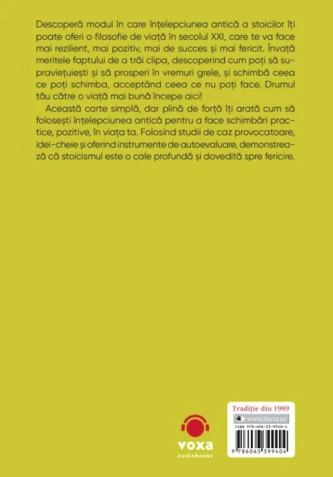 Descoperă modul în care înţelepciunea antică a stoicilor îţi poate oferi o filosofie de viaţă în secolul XXI, care te va face mai rezilient, mai pozitiv, mai de succes şi mai fericit. Învaţă meritele faptului de a trăi clipa, descoperind cum poţi să supravieţuieşti şi să prosperi în vremuri grele, şi schimbă ceea ce poţi schimba, acceptând ceea ce nu poţi face. Drumul tău către o viaţă mai bună începe aici!