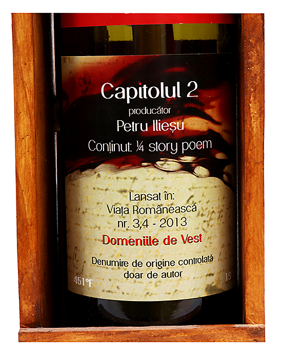 Versuri fantastice de Petru Ilieșu, păstrate într-o stică originală de vin, cu suport din lemn.