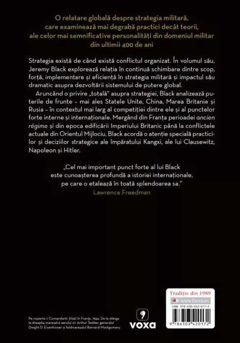 Strategia există de când există conflictul organizat. În volumul său, Jeremy Black explorează relația în continuă schimbare dintre scop, forță, implementare și eficiență în strategia militară și impactul său dramatic asupra dezvoltării sistemului de putere global. Aruncând o privire „totală“ asupra strategiei, Black analizează puterile de frunte – mai ales Statele Unite, China, Marea Britanie și Rusia – în contextul mai larg al competiției dintre ele și al punctelor forte interne și internaționale. Mergând din Franța perioadei ancien régime și din epoca edificării Imperiului Britanic până la conflictele actuale din Orientul Mijlociu, Black acordă o atenție specială practicilor și deciziilor strategice ale împăratului Kangxi, ale lui Clausewitz, Napoleon și Hitler.