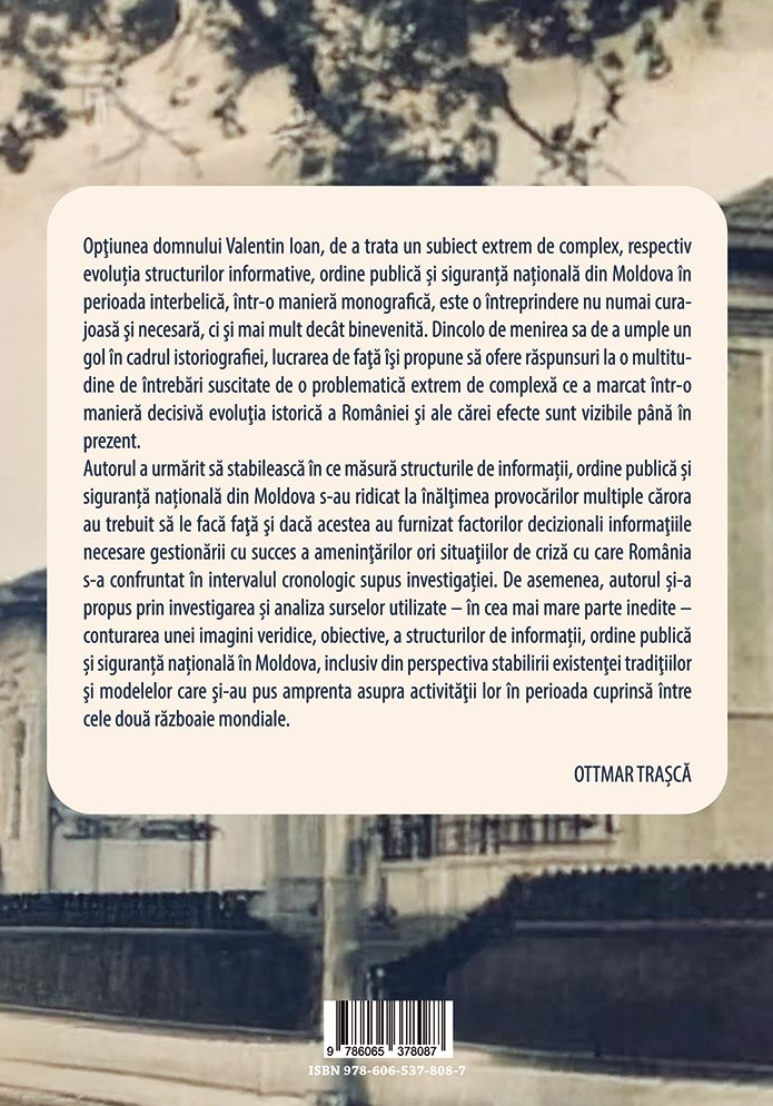 Opţiunea domnului Valentin Ioan, de a trata un subiect extrem de complex, respectiv evoluția structurilor informative, ordine publică și siguranță națională din Moldova în perioada interbelică, într-o manieră monografică, este o întreprindere nu numai curajoasă şi necesară, ci şi mai mult decât binevenită. Dincolo de menirea sa de a umple un gol în cadrul istoriografiei, lucrarea de faţă îşi propune să ofere răspunsuri la o multitudine de întrebări suscitate de o problematică extrem de complexă ce a marcat într-o manieră decisivă evoluţia istorică a României şi ale cărei efecte sunt vizibile până în prezent. Autorul a urmărit să stabilească în ce măsură structurile de informații, ordine publică și siguranță națională din Moldova s-au ridicat la înălţimea provocărilor multiple cărora au trebuit să le facă faţă şi dacă acestea au furnizat factorilor decizionali informaţiile necesare gestionării cu succes a ameninţărilor ori situaţiilor de criză cu care România s-a confruntat în intervalul cronologic supus investigației. De asemenea, autorul și-a propus prin investigarea și analiza surselor utilizate – în cea mai mare parte inedite – conturarea unei imagini veridice, obiective, a structurilor de informații, ordine publică și siguranță națională în Moldova, inclusiv din perspectiva stabilirii existenţei tradiţiilor şi modelelor care şi-au pus amprenta asupra activităţii lor în perioada cuprinsă între cele două războaie mondiale.
