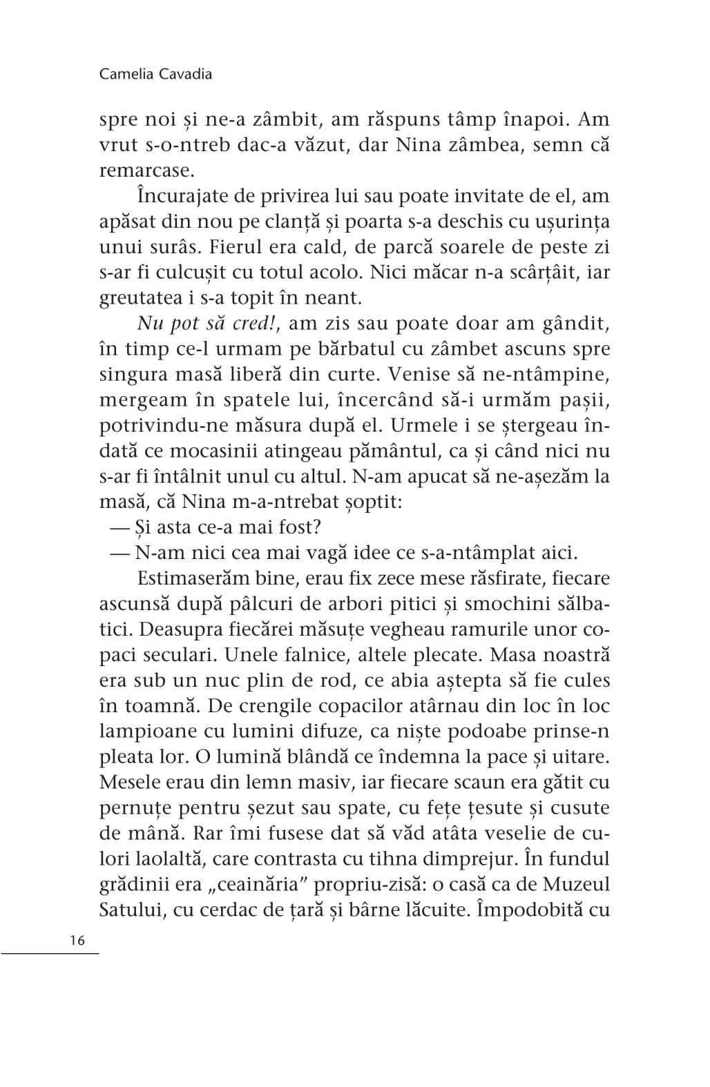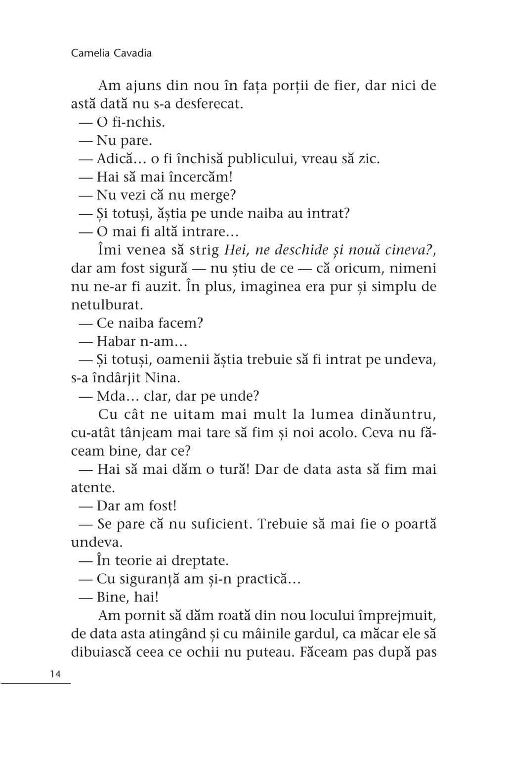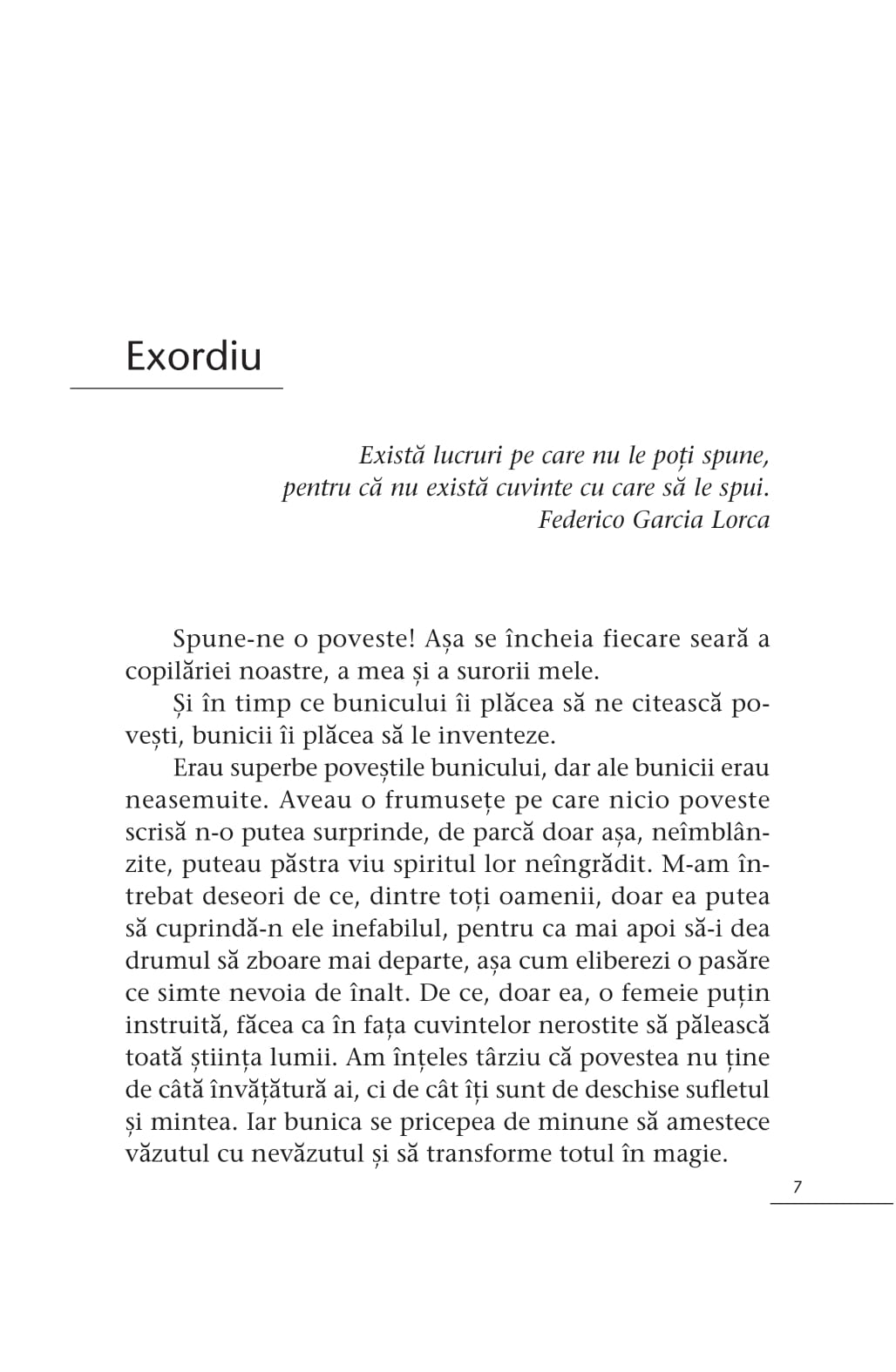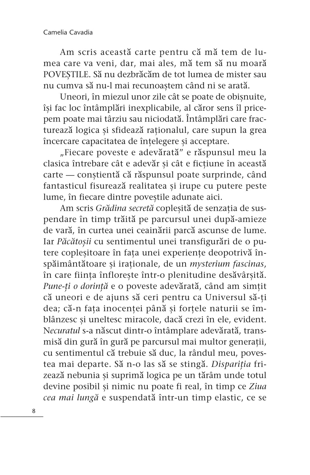 Am scris această carte pentru că mă tem de lumea care va veni, dar, mai ales, mă tem să nu moară POVEȘTILE. Să nu dezbrăcam de tot lumea de mister sau nu cumva să nul mai recunoaștem când ni se arată. Uneori, în miezul unor zile cât se poate de obișnuite, își fac loc întâmplări inexplicabile, al căror sens îl pricepem poate mai târziu sau niciodată. Întâmplări care fracturează logica și sfidează raționalul, care supun la grea încercare capacitatea de înțelegere și acceptare. Camelia Cavadia