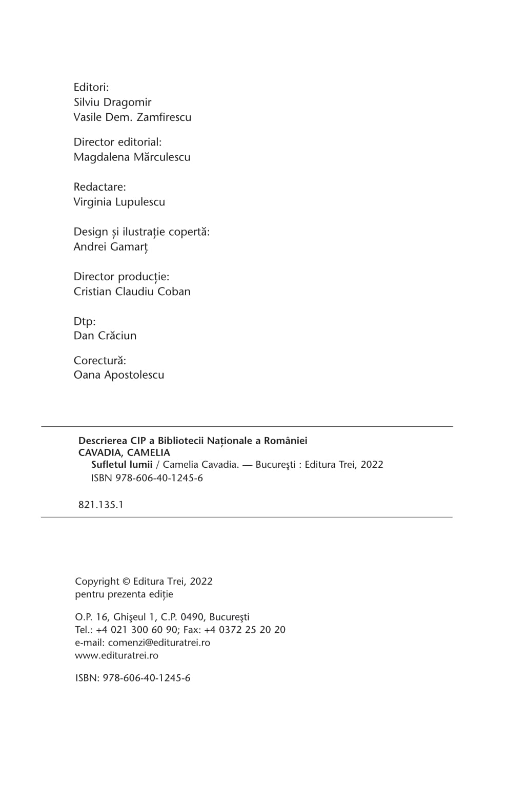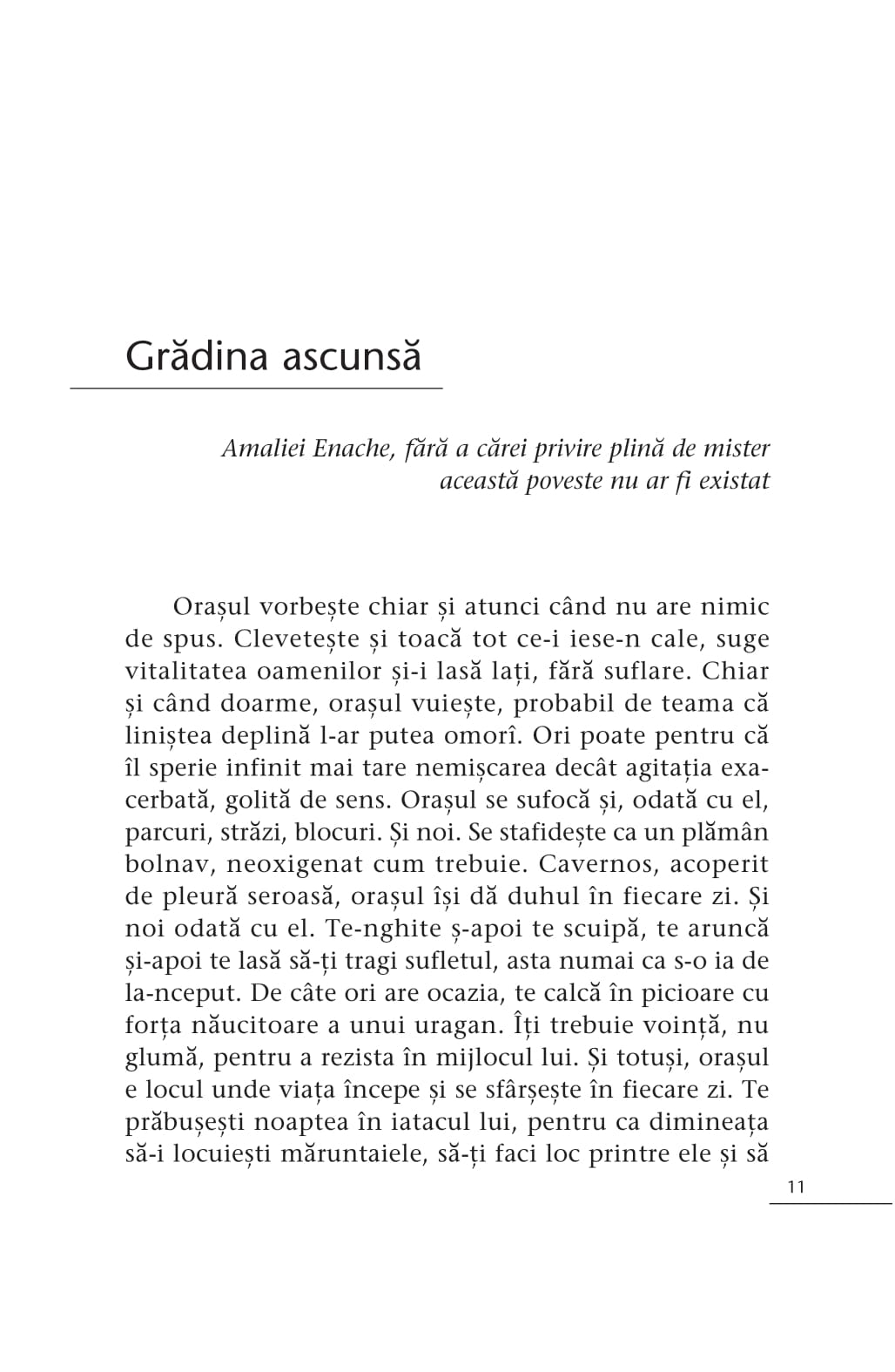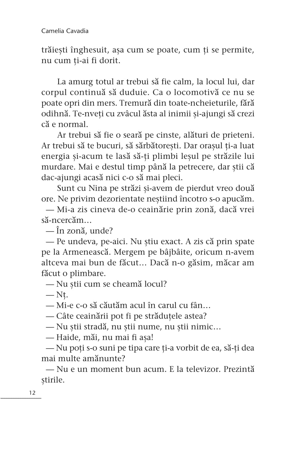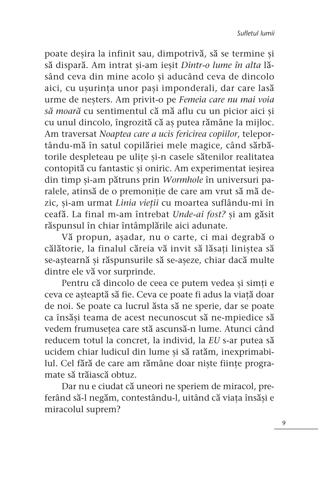 Am scris această carte pentru că mă tem de lumea care va veni, dar, mai ales, mă tem să nu moară POVEȘTILE. Să nu dezbrăcam de tot lumea de mister sau nu cumva să nul mai recunoaștem când ni se arată. Uneori, în miezul unor zile cât se poate de obișnuite, își fac loc întâmplări inexplicabile, al căror sens îl pricepem poate mai târziu sau niciodată. Întâmplări care fracturează logica și sfidează raționalul, care supun la grea încercare capacitatea de înțelegere și acceptare. Camelia Cavadia