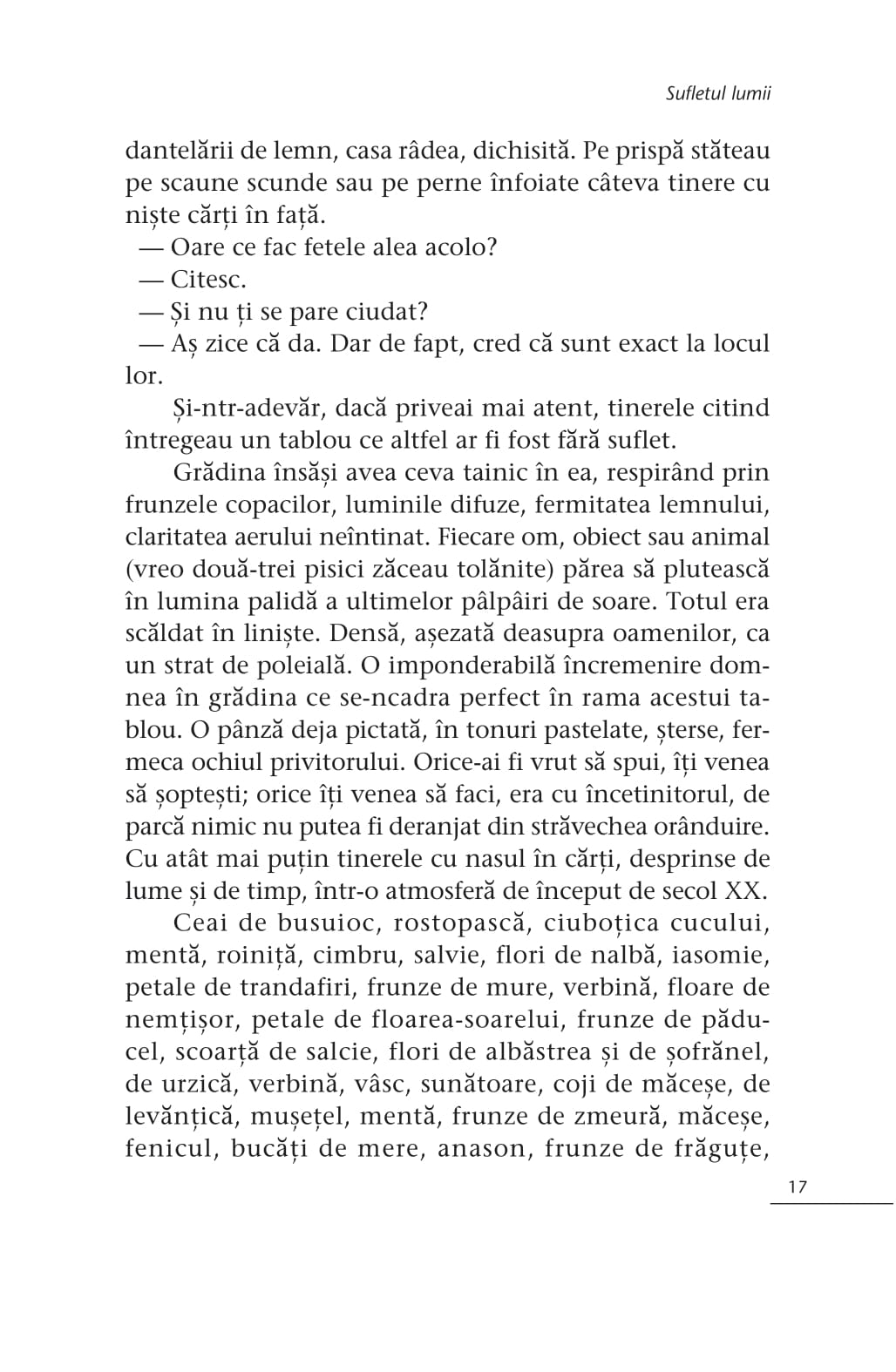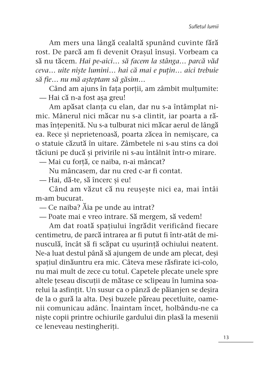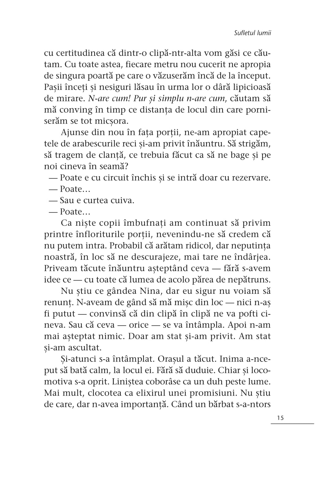 Sufletul lumii este o carte-univers, în care realul se amestecă cu fantasticul, urbanul cu ruralul, lumile interioare ale personajelor cu lumile exterioare, înmuiate când în lumină, când în întuneric. Însă poate cel mai pregnant dintre personajele create de Camelia Cavadia în această carte este prezența. Există o stare de prezență extraordinară în aproape fiecare dintre povestiri, o ancorare profundă în aici și acum, indiferent dacă timpul prezent este unul pământean sau unul mai degrabă nepământean, magic, aflat între lumi poate, iar cei care o experimentează, fie că sunt orășeni sofisticați, trăitori în aglomerări urbane mari, fie oameni simpli, de la țară, sunt nevoiți săși trăiască la o intensitate teribilă emoțiile, să stea cu ele, să le consume până la capăt. E o carte pe care o citești cu sufletul la gură și cu ochii măriți, care te poartă prin povești magice, când înspăimântătoare, precum cele spuse la căldura focului de bunica, când luminoase și atinse de aripi hieratice. Petronela Rotar, scriitoare