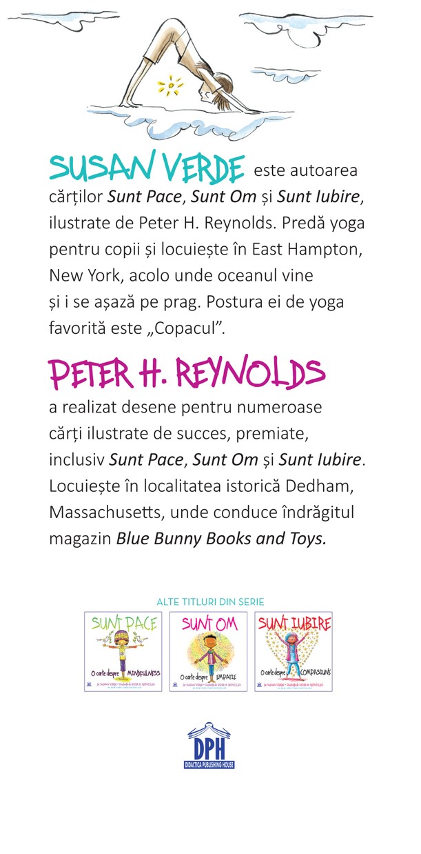“Sunt Yoga” încurajează copiii să exploreze lumea yoga și să facă loc în inimile lor pentru lumea de dincolo de ea. Cartea include un ghid al posturilor de yoga potrivite pentru copii și se adresează copiilor cu vârsta peste 4 ani.