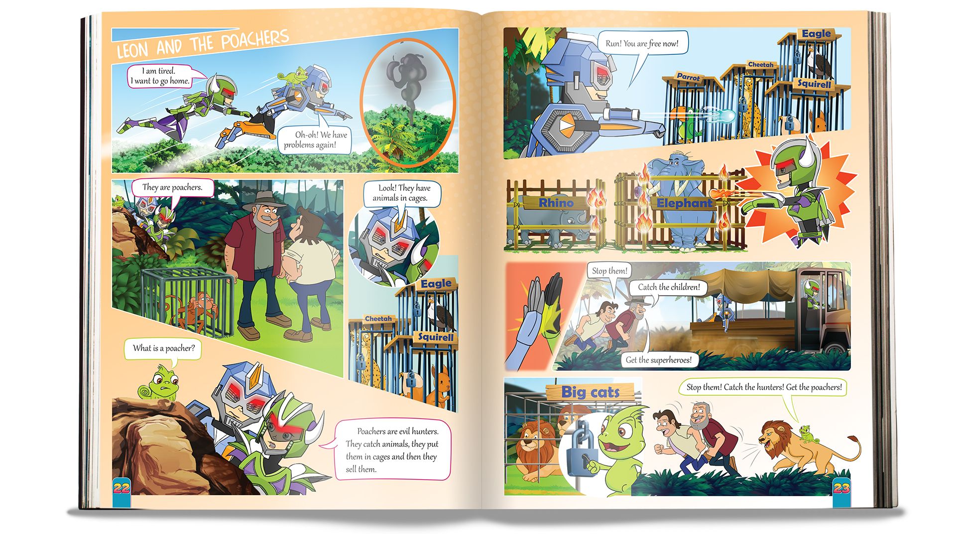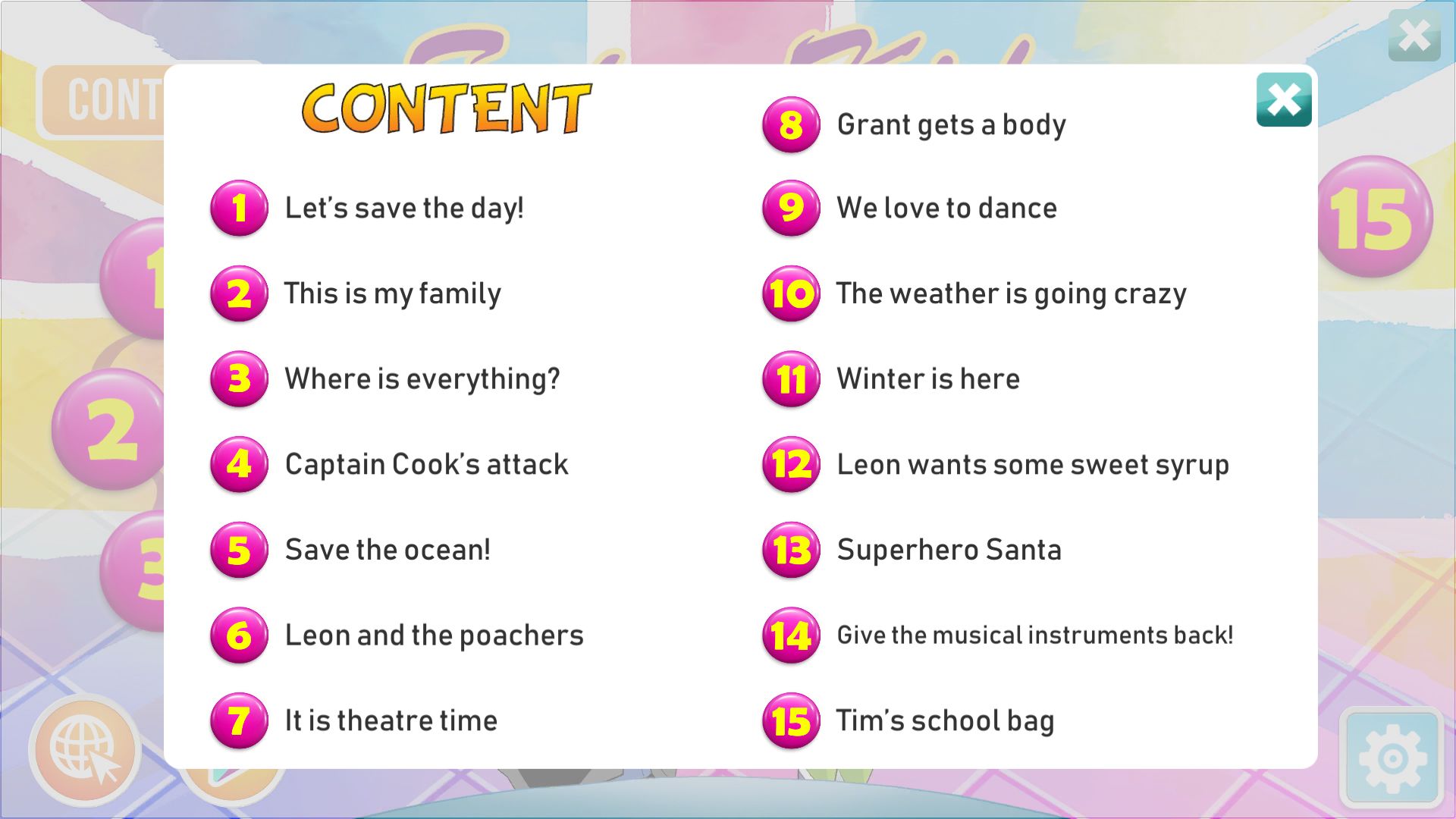 Aplicația conține 15 animații și 30 de jocuri educative și distractive. Cei doi eroi, alături de cameleonul Leon, îi invită pe copii să le fie alături în misiunea de salvare a oceanului și a animalelor, să-i vină de hac căpitanului Cook care a transformat Colosseum-ul într-un cașcaval și Turnul Eiffel într-o felie de pizza, savantului care se joacă cu anotimpurile și monstrului Rock care a venit să fure toate instrumentele muzicale de pe Pământ.