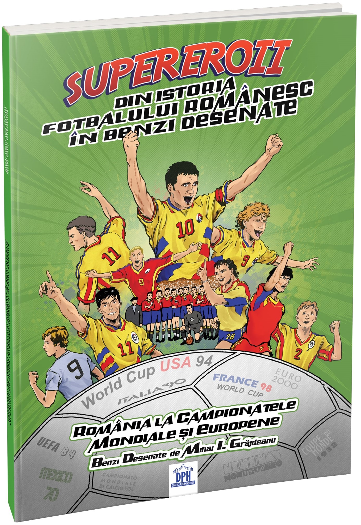 Cartea Supereroii din lumea fotbalului românesc în format bandă desenată, scrisă de Mihai Grajdeanu, prezintă istoria și momentele cheie ale echipei naționale de fotbal a României. Este o colecție captivantă de povestiri ilustrate despre meciuri memorabile, jucători legendari și victorii simbolice, începând cu primele participări la Campionatul Mondial până la performanțele Generației de Aur și cele mai recente turnee internaționale.