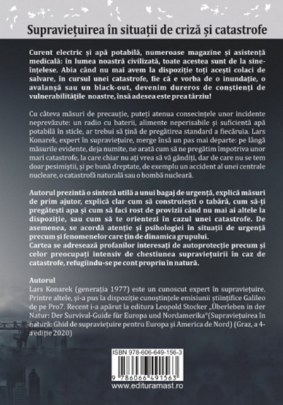 Cu cateva masuri de precautie, puteti atenua consecintele unor incidente neprevazute: un radio cu baterii, alimente nepensabile si suficienta apa potabila in stidr. ar trebui sa tina de pregatirea standard a fiecaruia Lars Konarek, expert in supravietuire, merge insa un pas mai departe: pe langa masurile evidente, deja numite, ne arata cum sa ne pregatim impotriva unor mari catastrofe, la care chiar nu ati vrea sa va ganditi, dar de care nu se tem doar pesimistii, sl pe buna dreptate, de exemplu un accident al unei centrale nucleare, o catastrofa naturala sau o bomba nudeara.
