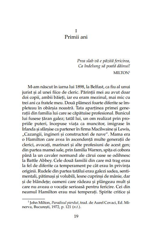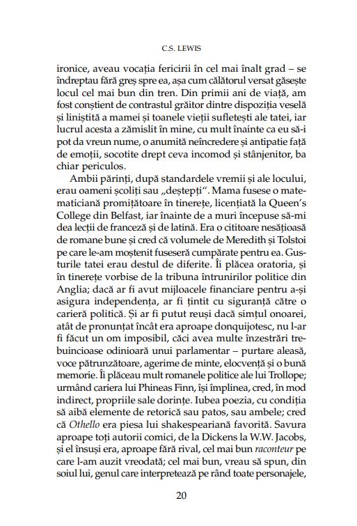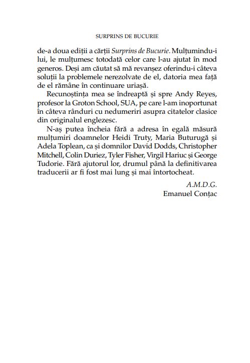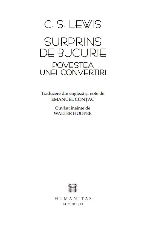 Pentru publicul larg, C.S. Lewis (1898–1963) este autorul celebrelor Cronici din Narnia, o serie de poveşti fantasy în curs de ecranizare. Mai mult, figura acestui profesor de literatură care a predat la Oxford şi la Cambridge, fiind un fel de simbol al elitei universitare britanice, şi povestea lui de iubire cu Joy Gresham au inspirat un frumos film, Shadowlands (Tărâmul umbrelor), cu sir Anthony Hopkins şi Debra Winger în rolurile principale. Mai puţin cunoscut de publicul larg este faptul că C.S. Lewis a scris remarcabile studii de literatură medievală şi critică literară şi că esocotit cel mai important apologet al creştinismului din secolul XX (unele scrieri ale sale pe tema credinţei - Despre minuni, Cele patru iubiri, Problema durerii, Sfaturile unui diavol bătrân către unul mai tânăr, Despre lumea aceasta şi despre alte lumi - au fost traduse la Humanitas). În Marea Britanie, Lewis a devenit celebru încă din timpul vieţii graţie conferinţelor lui vibrante despre creştinism, transmise la radio în timpul războiului. Scrierile şi cu atât mai mult conferinţele creştine ale lui Lewis erau atât de convingătoare pentru că izvorau din încărcătura emoţională a propriei convertiri. Şi chiar despre această convertire, oarecum surprinzătoare pentru un tânăr intelectual studios, lucid, deloc lipsitde spirit critic, e vorba în cartea de faţă. Surprins de Bucurie este, în fond, o autobiografie spirituală: în spatele vieţii exterioare seconturează evoluţia lăuntrică a autorului de la credinţa convenţională din copilărie la necredinţa frivolă din prima tinereţe şi, în fine, la credinţa profundă în Dumnezeul creştin.