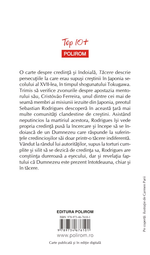 O carte despre credinţă şi îndoială, Tăcere descrie persecuţiile la care erau supuşi creştinii în Japonia secolului al XVII-lea, în timpul shogunatului Tokugawa. Trimis să verifice zvonurile despre apostazia mentorului său, Cristóvão Ferreira, unul dintre cei mai de seamă membri ai misiunii iezuite din Japonia, preotul Sebastian Rodrigues descoperă în această ţară mai multe comunităţi clandestine de creştini. Asistînd neputincios la martiriul acestora, Rodrigues îşi vede propria credinţă pusă la încercare şi începe să se îndoiască de un Dumnezeu care răspunde la suferinţele credincioşilor săi doar printr-o tăcere indiferentă. Vîndut la rîndul lui autorităţilor, supus la torturi cumplite şi silit să se dezică de credinţa sa, Rodrigues are conştiinţa dureroasă a eşecului, dar şi revelaţia faptului că Dumnezeu este prezent întotdeauna, chiar şi în tăcere.