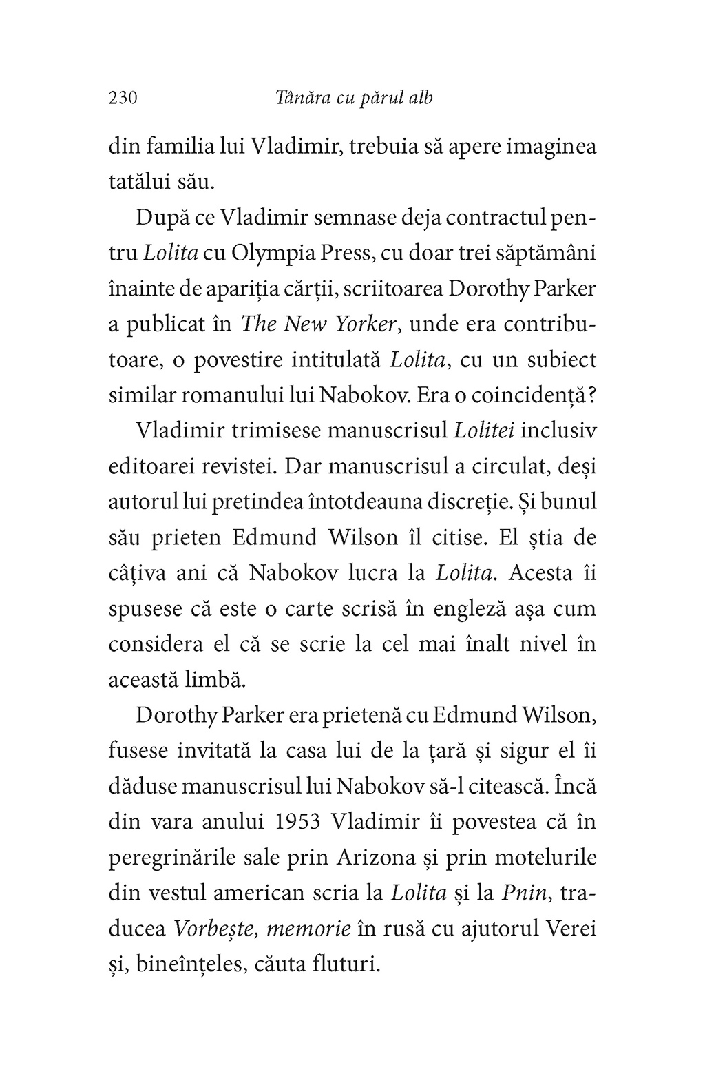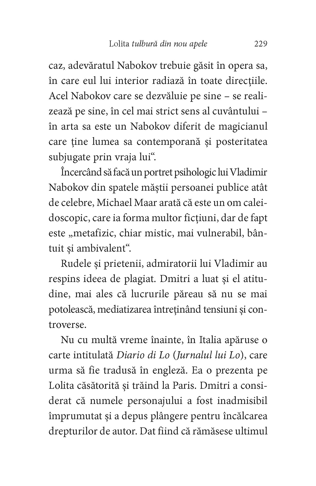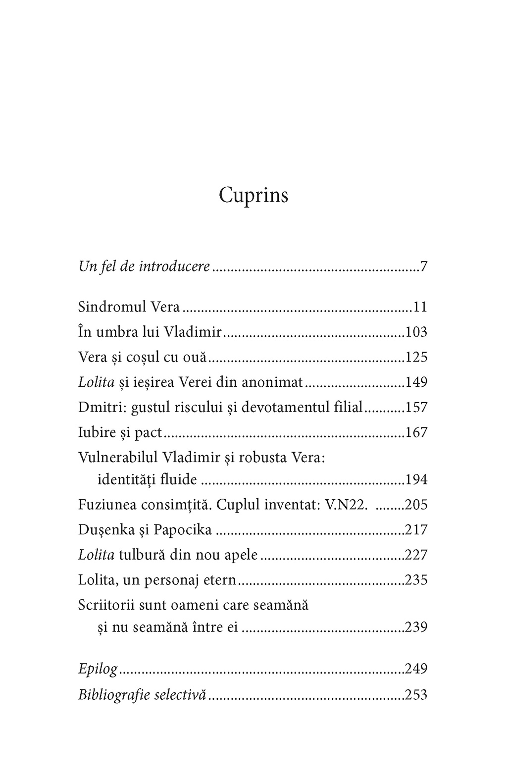 Despre cărțile lui Vladimir Nabokov, unul dintre cei mai importanți scriitori ai secolului XX, s-a scris mult. Dar și viața lui personală i-a preocupat pe cercetători: provenind dintr-o familie aristocratică, a părăsit Rusia natală de teama bolșevicilor și a locuit în Germania, Franța și Statele Unite înainte să se stabilească definitiv în Elveția. Datorită personalității charismatice, a avut foarte mulți admiratori. Și iubite. Cu toate acestea, a rămas alături de Vera, cea care i-a fost soție timp de 52 de ani. Cei interesați de viața lor de familie au la dispoziție numeroasele interviuri ale lui Vladimir, scrisorile sale către Vera, însă nu și vocea Verei. Vera a stat mereu în umbra soțului ei, și-a distrus scrisorile destinate acestuia și a păstrat o tăcere totală în privința relației lor. Ca femeie, ea pare că nu există în acest cuplu... Încercînd să înțeleagă ce anume i-a făcut să rămînă împreună atîta timp, Aurora Liiceanu analizează, pe lîngă operele lui Vladimir Nabokov, articole și cărți despre cei doi, dar și mărturiile fiului lor, Dmitri. Vladimir s-a îndrăgostit de mai multe femei. Despre unele iubiri a scris, pe altele le-a amintit în treacăt ca fiind simple aventuri neimportante. Vera i le-a tolerat pe toate și l-a susținut întotdeauna necondiționat. De ce? Un răspuns, spune Aurora Liiceanu, ar putea fi personalitățile lor atît de diferite: el, traversînd cu ușurință granița dintre imaginație și real, ea, puternic ancorată în realitate, complet dedicată proiectului său de viață – acela de a-și ajuta soțul să devină celebru –, convinsă că niciodată nimic nu‑i va despărți.