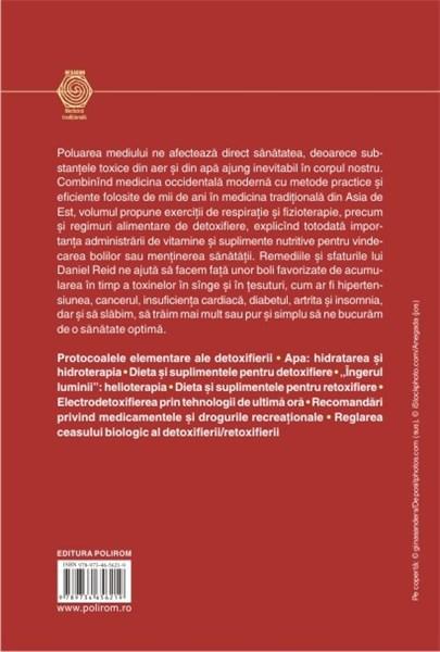 Poluarea mediului ne afecteaza direct sanatatea, deoarece substantele toxice din aer si din apa ajung inevitabil in corpul nostru. Combinind medicina occidentala moderna cu metode practice si eficiente folosite de mii de ani in medicina traditionala din Asia de Est, volumul propune exercitii de respiratie si fizioterapie, precum si regimuri alimentare de detoxifiere, explicind totodata importanta administrarii de vitamine si suplimente nutritive pentru vindecarea bolilor sau mentinerea sanatatii. Remediile si sfaturile lui Daniel Reid ne ajuta sa facem fata unor boli favorizate de acumularea in timp a toxinelor in singe si in tesuturi, cum ar fi hipertensiunea, cancerul, insuficienta cardiaca, diabetul, artrita si insomnia, dar si sa slabim, sa traim mai mult sau pur si simplu sa ne bucuram de o sanatate optima.
