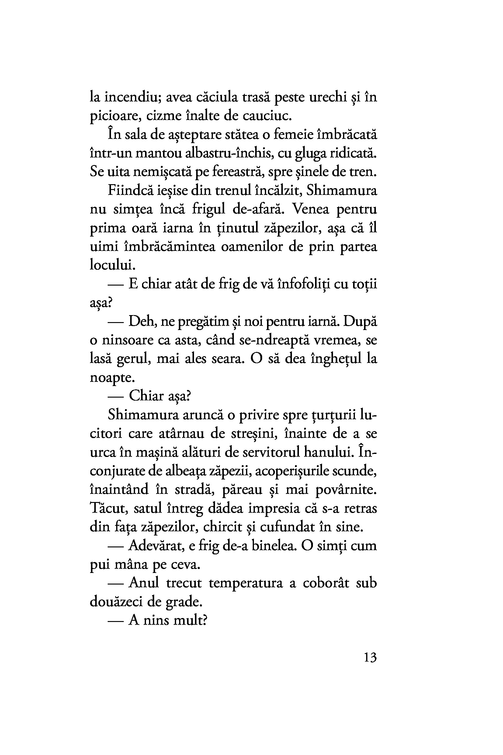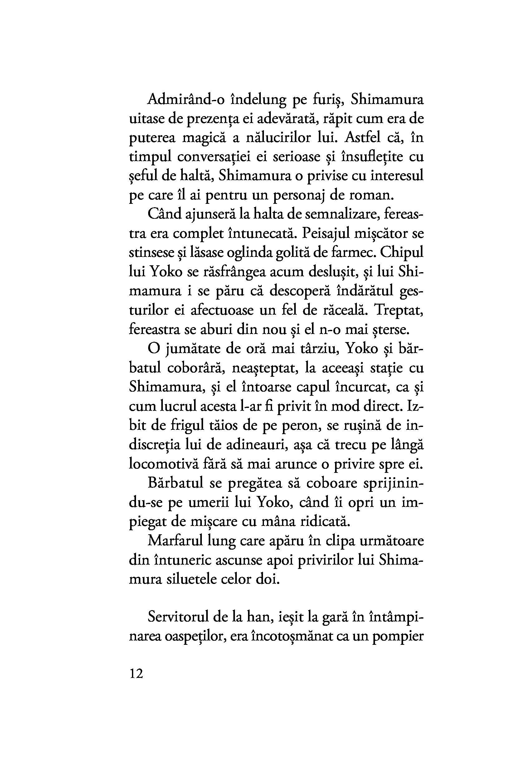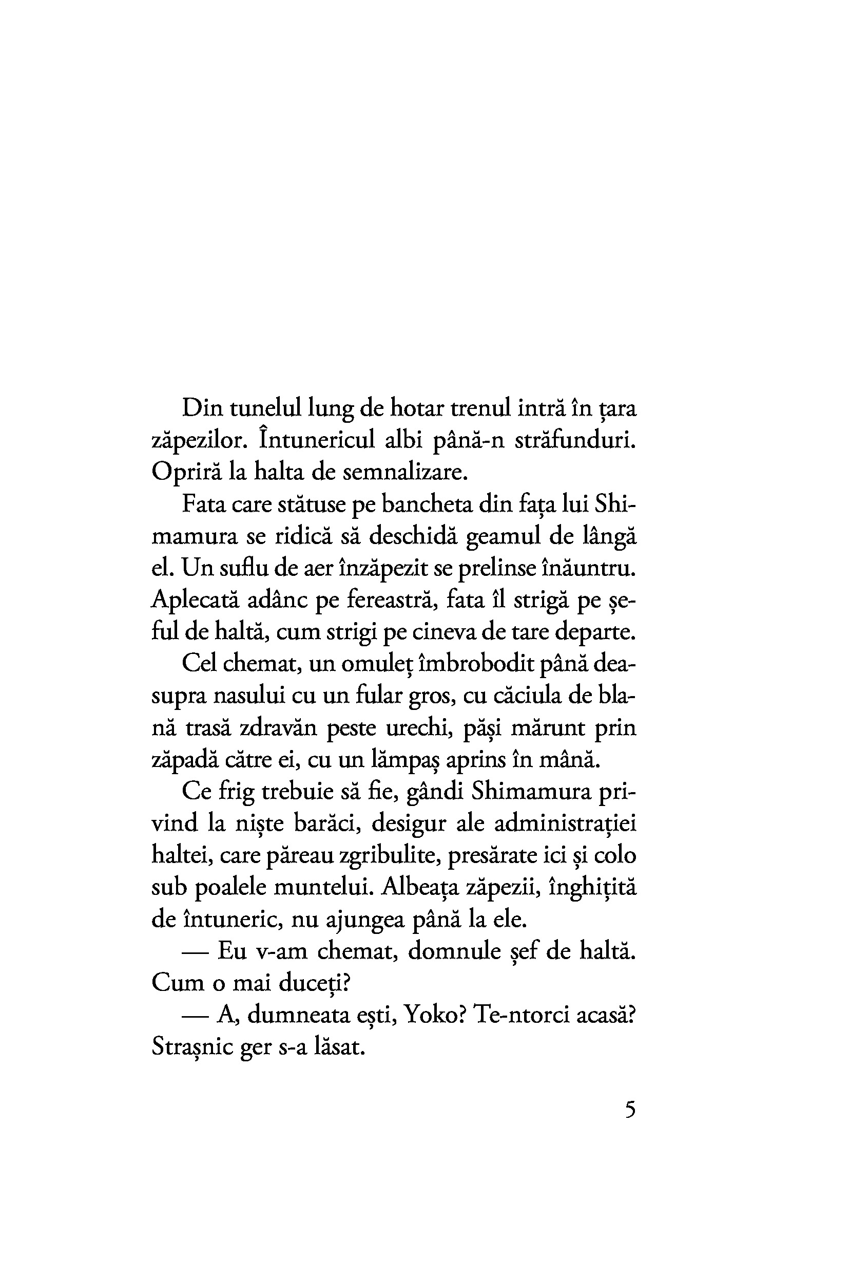 Oscilând între afecțiunea fățișă și necondiționată a gheișei și farmecul misterios al tăcutei Yoko, al cărei chip îl deslușește fugar, Shimamura este mereu un om al inacțiunii, iar pasivitatea lui o condamnă pe Komako să rămână prinsă fără scăpare în păienjenișul relațiilor și obligațiilor din țara zăpezilor.