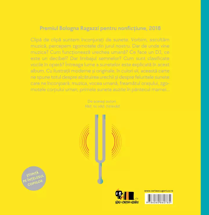 Clipă de clipă suntem înconjurați de sunete. Vorbim, ascultăm muzică, percepem zgomotele din jurul nostru. Dar de unde vine muzica? Cum funcționează urechea umană? Ce face un DJ, ce este un decibel? Dar limbajul semnelor? Cum sunt clasificate vocile în operă? Întreaga lume a sunetelor este explicată în acest album. Cu ilustrații moderne și originale, în culori vii, această carte ne spune totul despre alcătuirea urechii și despre feluritele sunete care ne înconjoară: muzica, vocea umană, freamătul orașului, zgomotele corpului uman, primele sunete auzite în pântecul mamei...