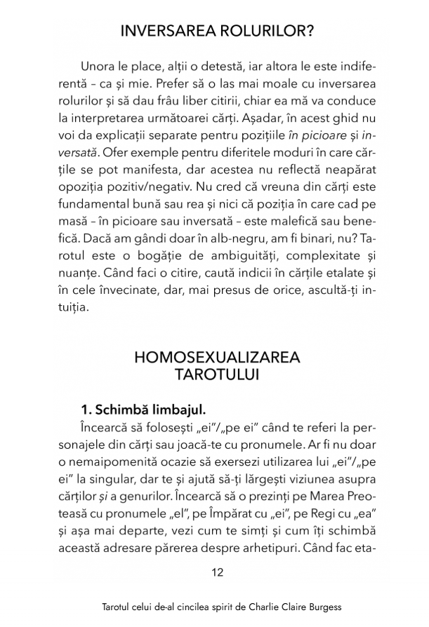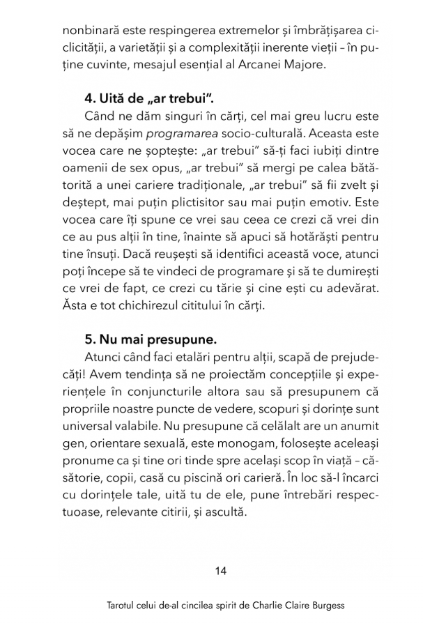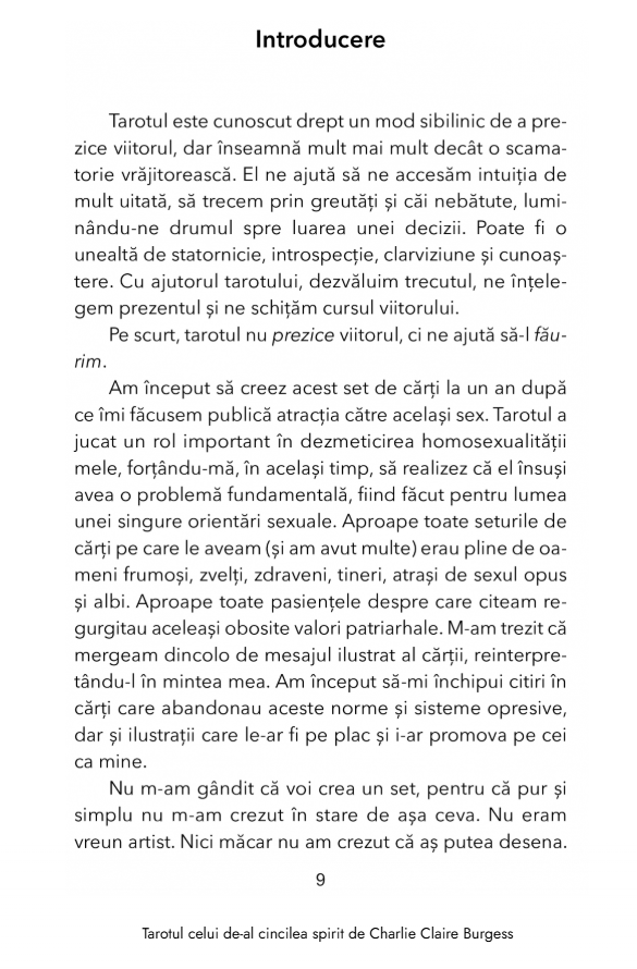 Tarotul da ce are el mai bun in situatii limita, in joc de nuante. Cu cat il folosim mai mult, cu atat vedem mai bine ca totul este fluid: genul, sensul, chiar si timpul. Toti suntem fiinte de pamant, aer, foc si apa, tinute laolalta de al cincilea element: spiritul.