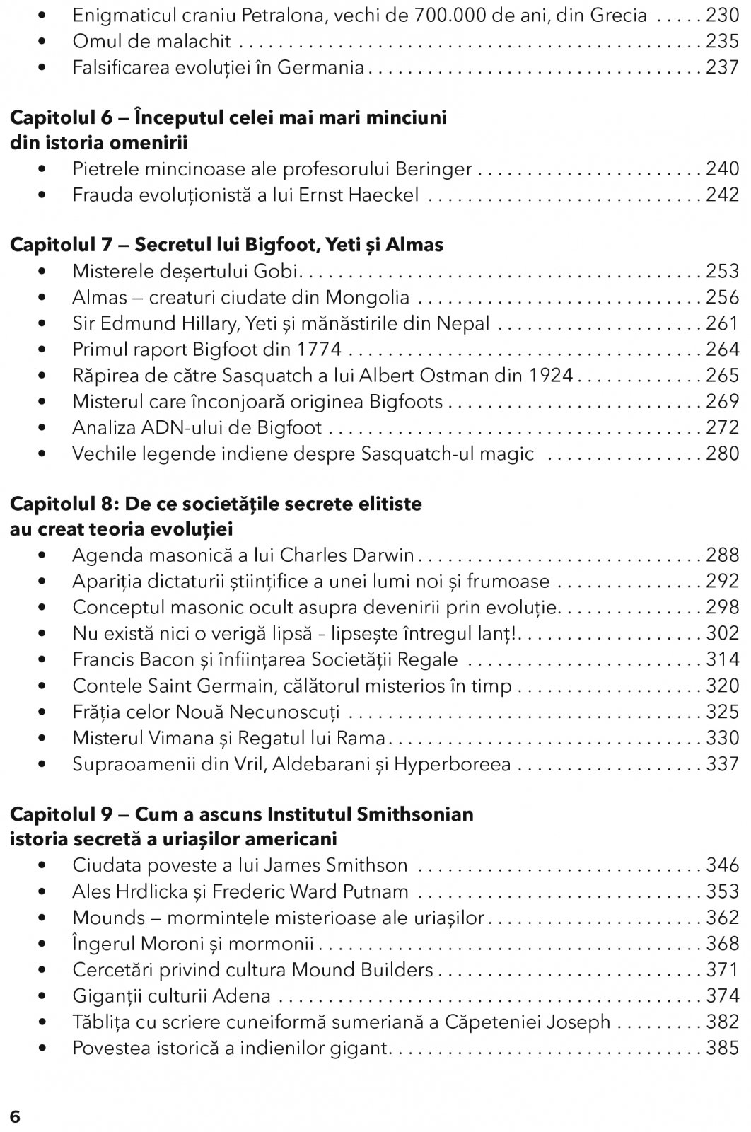 Adevarul socant este ca intreaga omenire a fost mintita de secole cu privire la originile sale. Organizatii puternice au incercat sa creeze o dictatura stiintifica in care orice opinie divergenta este suprimata sau combatuta, iar Charles Darwin a fost mana lor dreapta. Dovezile impotriva teoriei evolutiei, precum si descoperirile si artefactele arheologice, antropologice si paleonto­logice neconforme sunt fie intentionat interpretate gresit, manipulate, distruse, fie pur si simplu ascunse in arhive inaccesibile. Dar de ce? De ce se teme cineva si ce anume incearca sa ascunda cu atata incapatanare?