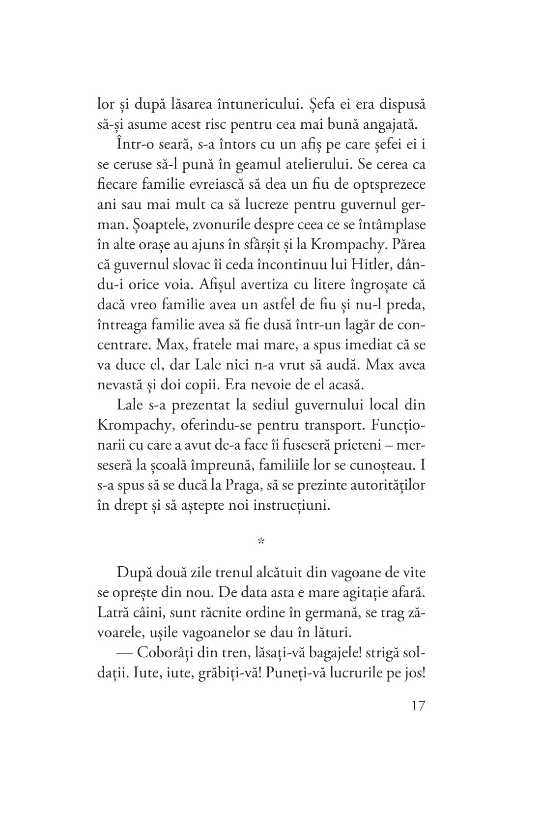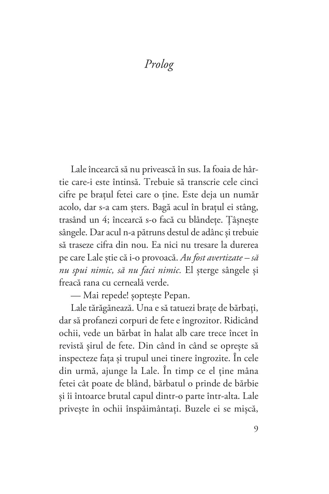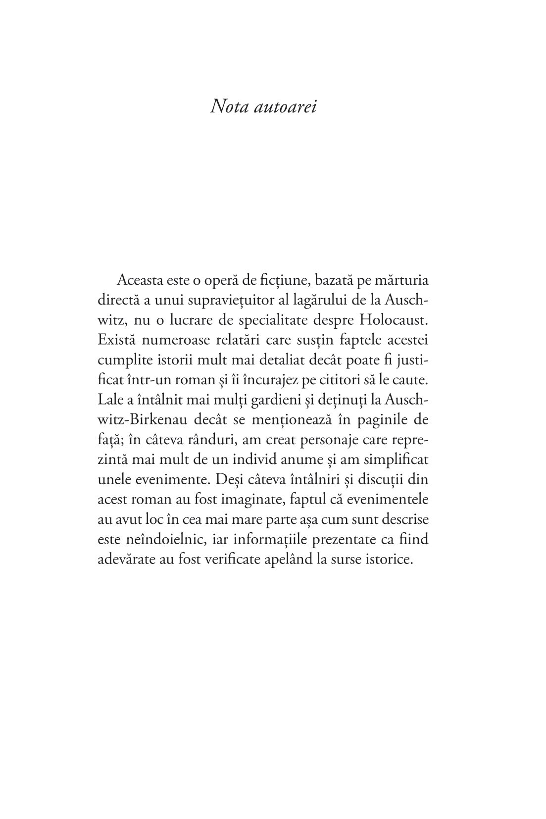 Tatuatorul de la Auschwitz se bazează pe povestea din spatele unuia dintre cele mai puternice simboluri ale Holocaustului: numerele verzi-albăstrui tatuate pe brațele prizonierilor, femei și bărbați deopotrivă. Când lui Lale i se oferă ocazia de a fi Tätowierer, tânărul evreu slovac înțelege că aceasta poate fi șansa lui să supraviețuiască. De la masa la care lucrează, nici nu i se permite să ridice capul spre semenii săi, al căror destin îl pecetluiește astfel. Dar într-o zi reușește să surprindă privirea unei tinere al cărei nume îl află în cele din urmă: Gita.