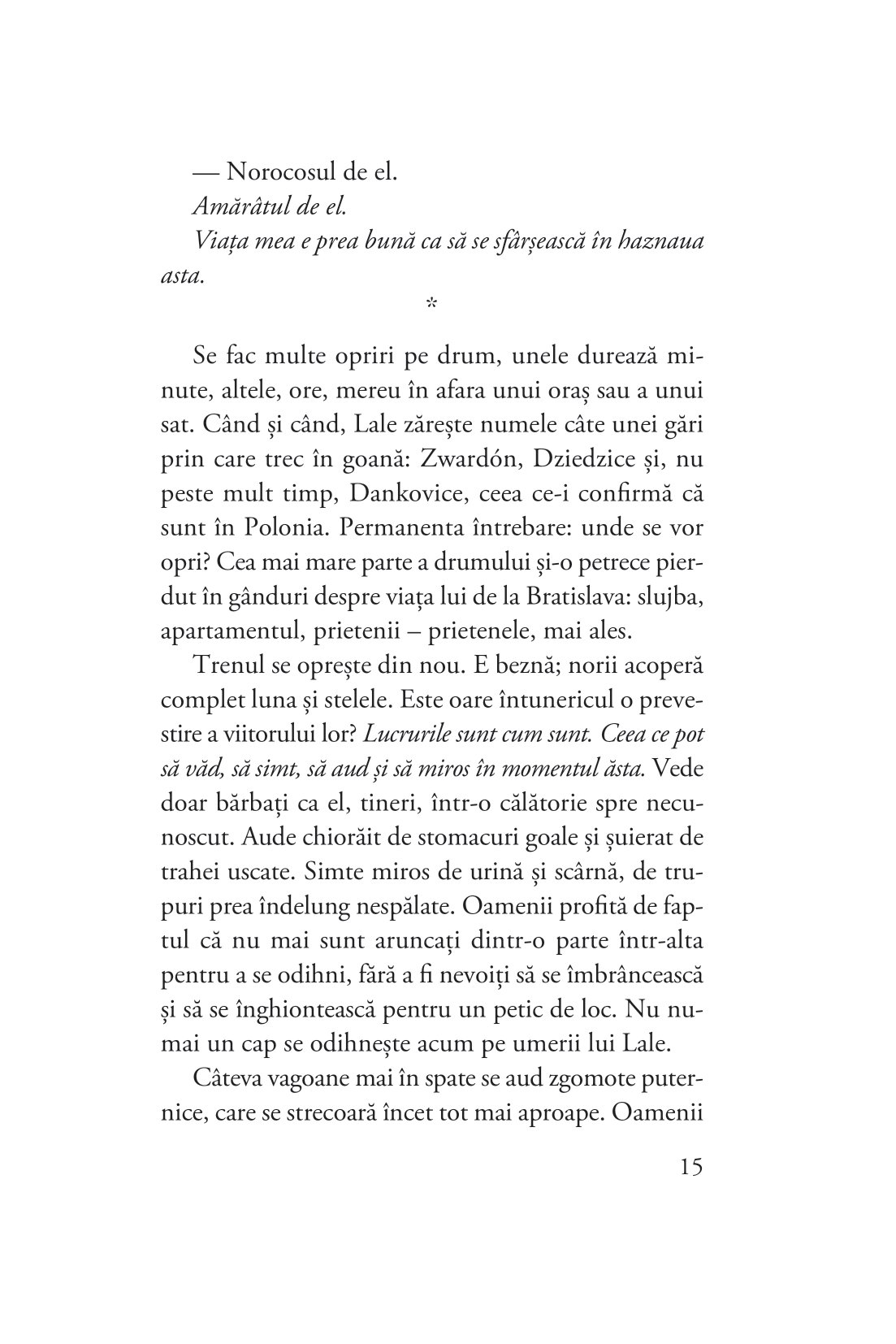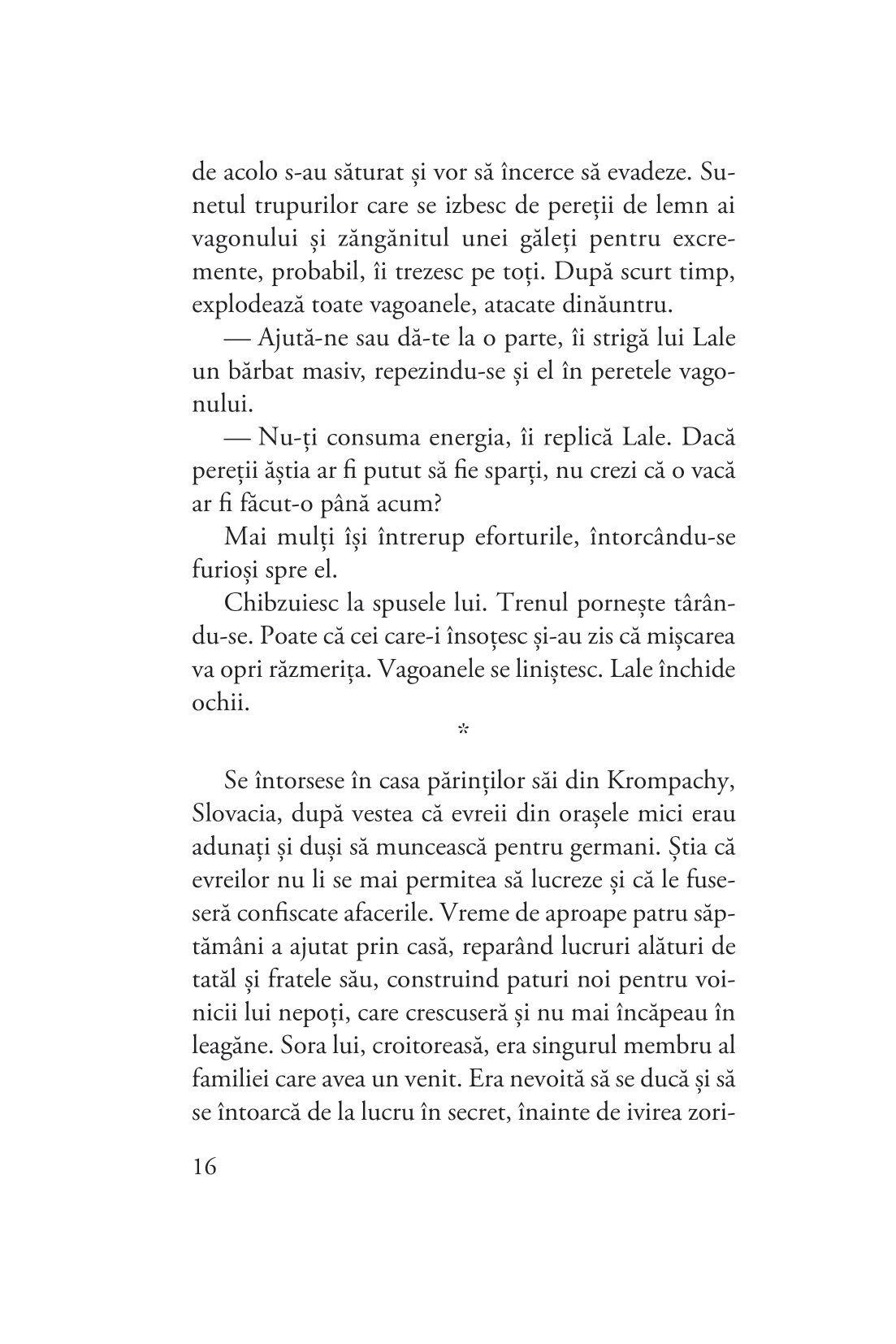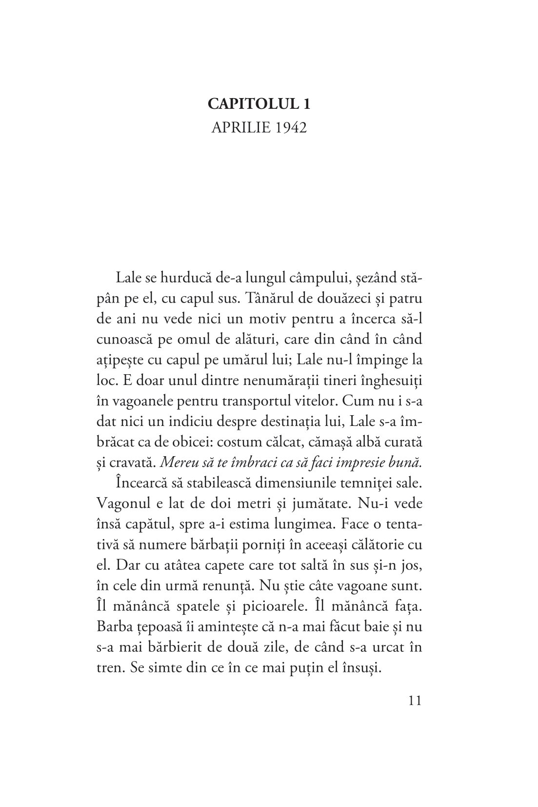 Tatuatorul de la Auschwitz se bazează pe povestea din spatele unuia dintre cele mai puternice simboluri ale Holocaustului: numerele verzi-albăstrui tatuate pe brațele prizonierilor, femei și bărbați deopotrivă. Când lui Lale i se oferă ocazia de a fi Tätowierer, tânărul evreu slovac înțelege că aceasta poate fi șansa lui să supraviețuiască. De la masa la care lucrează, nici nu i se permite să ridice capul spre semenii săi, al căror destin îl pecetluiește astfel. Dar într-o zi reușește să surprindă privirea unei tinere al cărei nume îl află în cele din urmă: Gita.