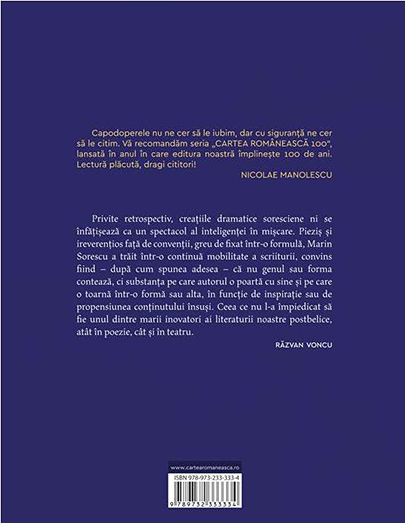 Privite retrospectiv, creațiile dramatice soresciene ni se înfățișează ca un spectacol al inteligenței în mișcare. Pieziș și ireverențios față de convenții, greu de fixat într-o formulă, Marin Sorescu a trăit într-o continuă mobilitate a scriiturii, convins fiind – după cum spunea adesea – că nu genul sau forma contează, ci substanța pe care autorul o poartă cu sine și pe care o toarnă într-o formă sau alta, în funcție de inspirație sau de propensiunea conținutului însuși. Ceea ce nu l-a împiedicat să fie unul dintre marii inovatori ai literaturii noastre postbelice, atât în poezie, cât și în teatru. - Răzvan Voncu