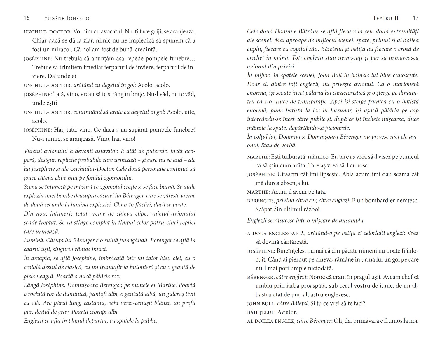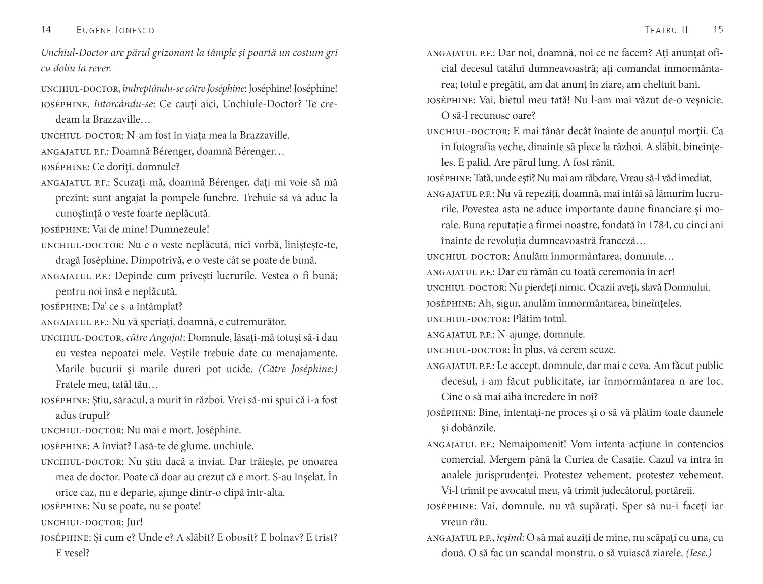 Am petrecut douăzeci de ani în universul lui Eugène Ionesco jucând Scaunele… Întâi în limba română și de doi ani și în limba franceză. Ce univers genial! N-am înțeles niciodată de ce opera lui Ionesco este considerată ca făcând parte din genul absurdului… Este universul unui geniu, în toată splendoarea umanității, a inteligenței, a umorului și a tragismului său. Ești binecuvântat dacă ai acces la această Lume! Domnule Eugène Ionesco, chapeau bas!