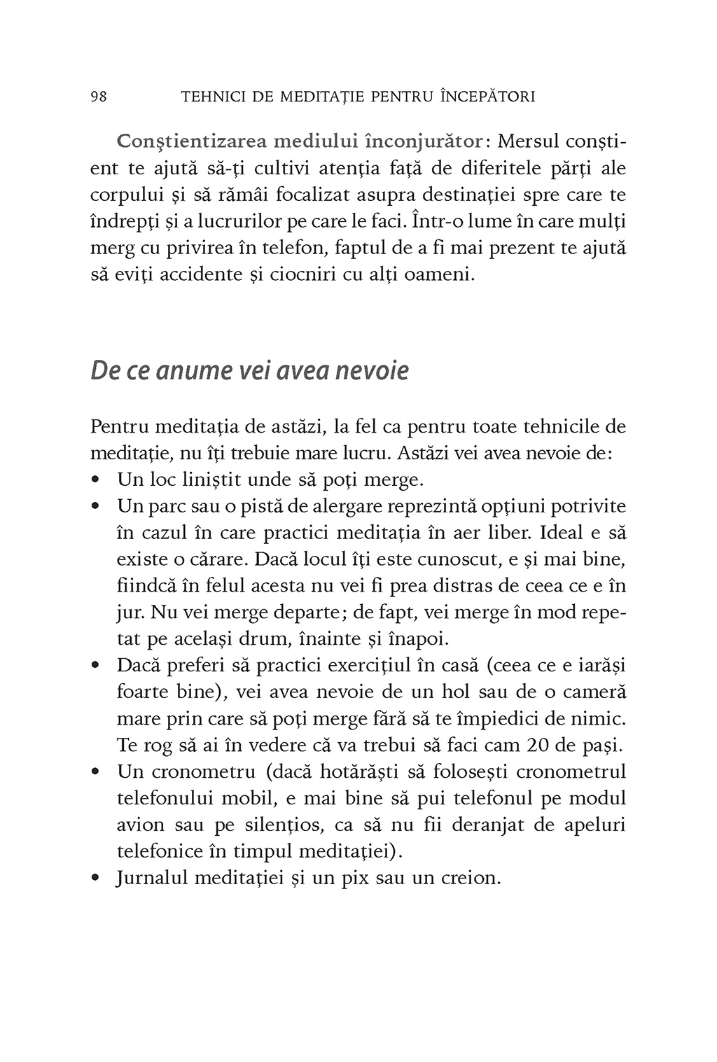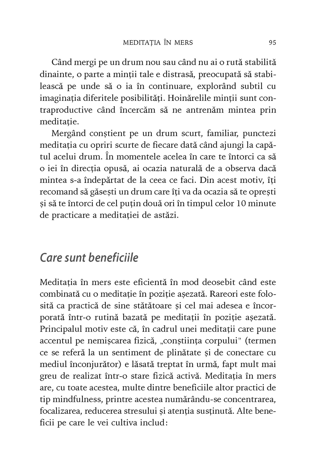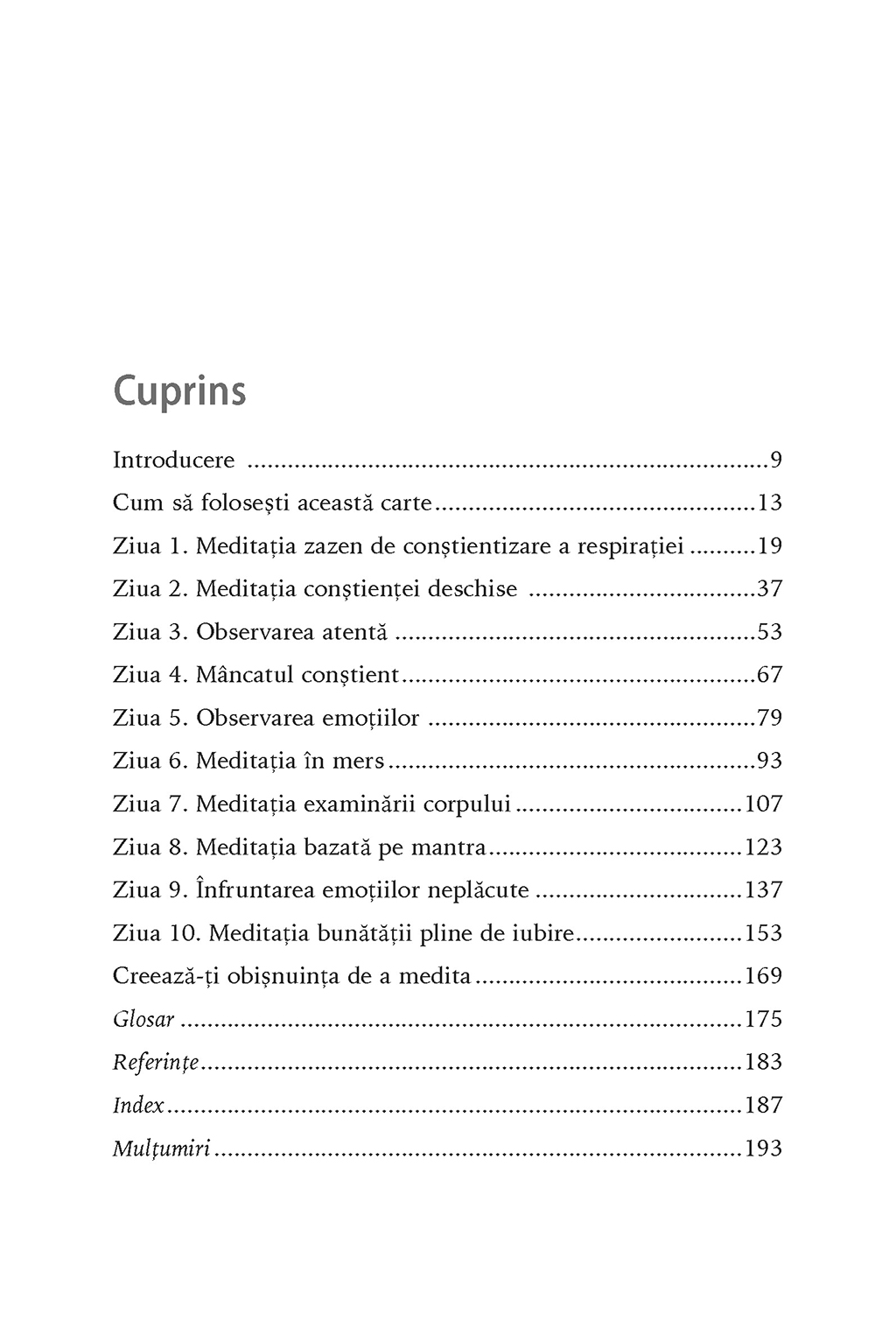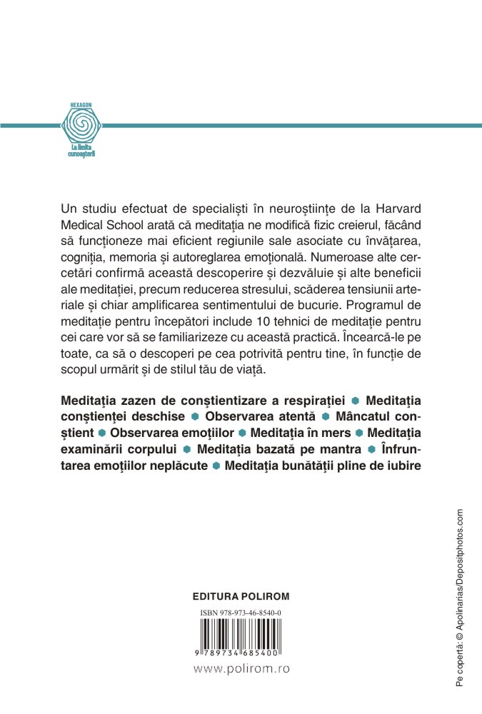Un studiu efectuat de specialiști în neuroștiințe de la Harvard Medical School arată că meditația ne modifică fizic creierul, făcînd să funcționeze mai eficient regiunile sale asociate cu învățarea, cogniția, memoria și autoreglarea emoțională. Numeroase alte cercetări confirmă această descoperire și dezvăluie și alte beneficii ale meditației, precum reducerea stresului, scăderea tensiunii arteriale și chiar amplificarea sentimentului de bucurie. Programul de meditație pentru începători include 10 tehnici de meditație pentru cei care vor să se familiarizeze cu această practică. Încearcă-le pe toate, ca să o descoperi pe cea potrivită pentru tine, în funcție de scopul urmărit și de stilul tău de viață.