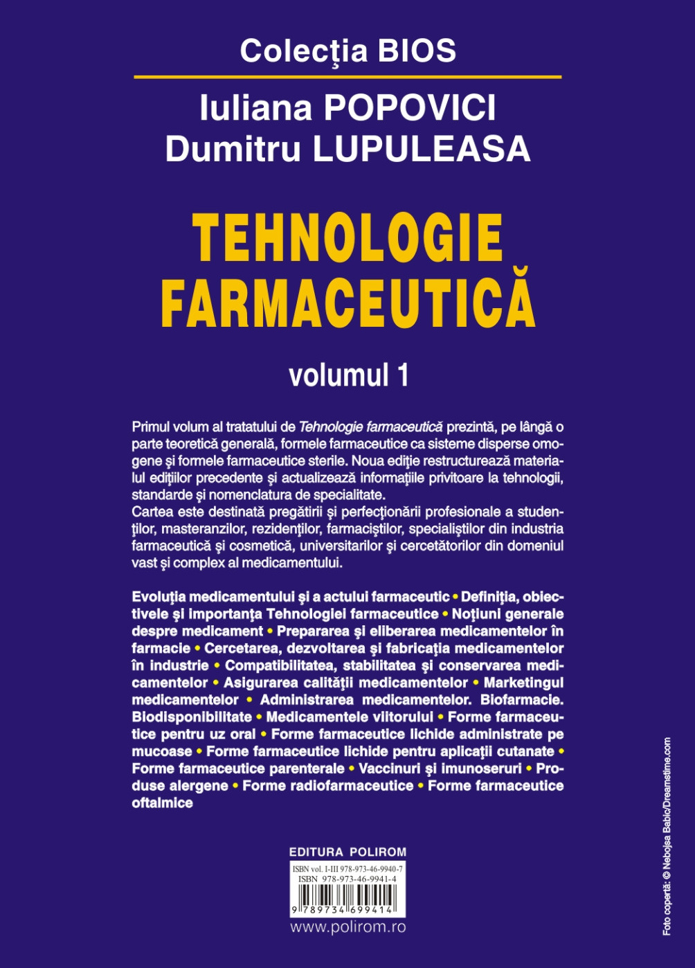 Primul volum al tratatului de Tehnologie farmaceutică prezintă, pe lângă o parte teoretică generală, formele farmaceutice ca sisteme disperse omogene și formele farmaceutice sterile. Noua ediție restructurează materialul edițiilor precedente și actualizează informațiile privitoare la tehnologii, standarde și nomenclatura de specialitate.