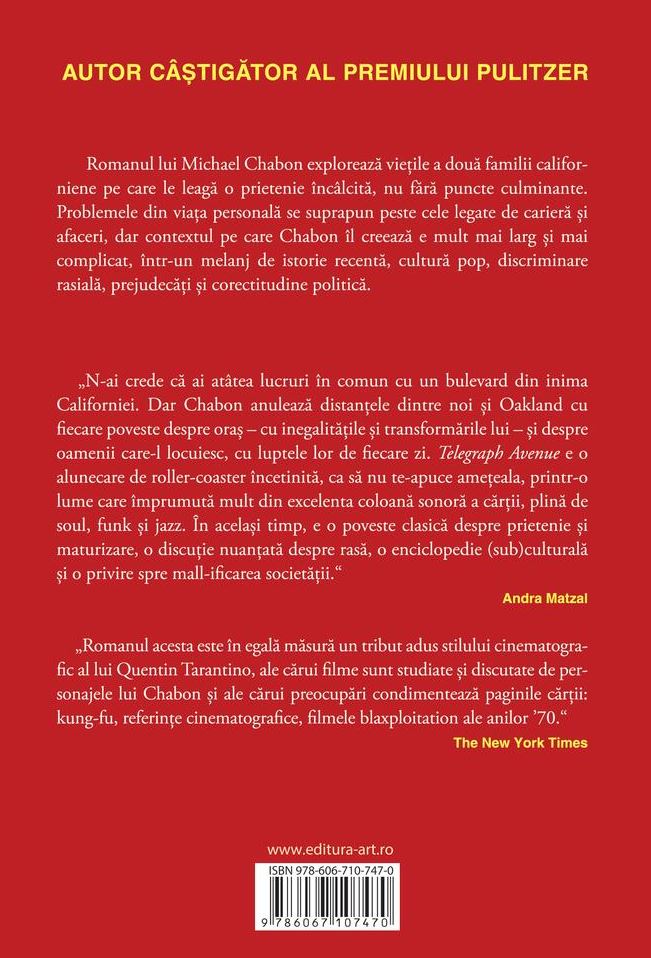 "N-ai crede că ai atâtea lucruri in comun cu un bulevard din inima Californiei. Dar Chabon anulează distanțele dintre noi și Oakland cu fiecare poveste despre oraș - cu inegalitățile și transformările lui – și despre oamenii care-l locuiesc, cu luptele lor de fiecare zi. Telegraph Avenue e o alunecare de roller-coaster încetinită, ca să nu te-apuce amețeala, printr-o lume care împrumută mult din excelenta coloană sonoră a cărții, plină de soul, funk și jazz. În același timp, e o poveste clasică despre prietenie și maturizare, o discuție nuanțată despre rasă, o enciclopedie (sub)culturală și o privire spre mall-ificarea societății.“ Andra Matzal