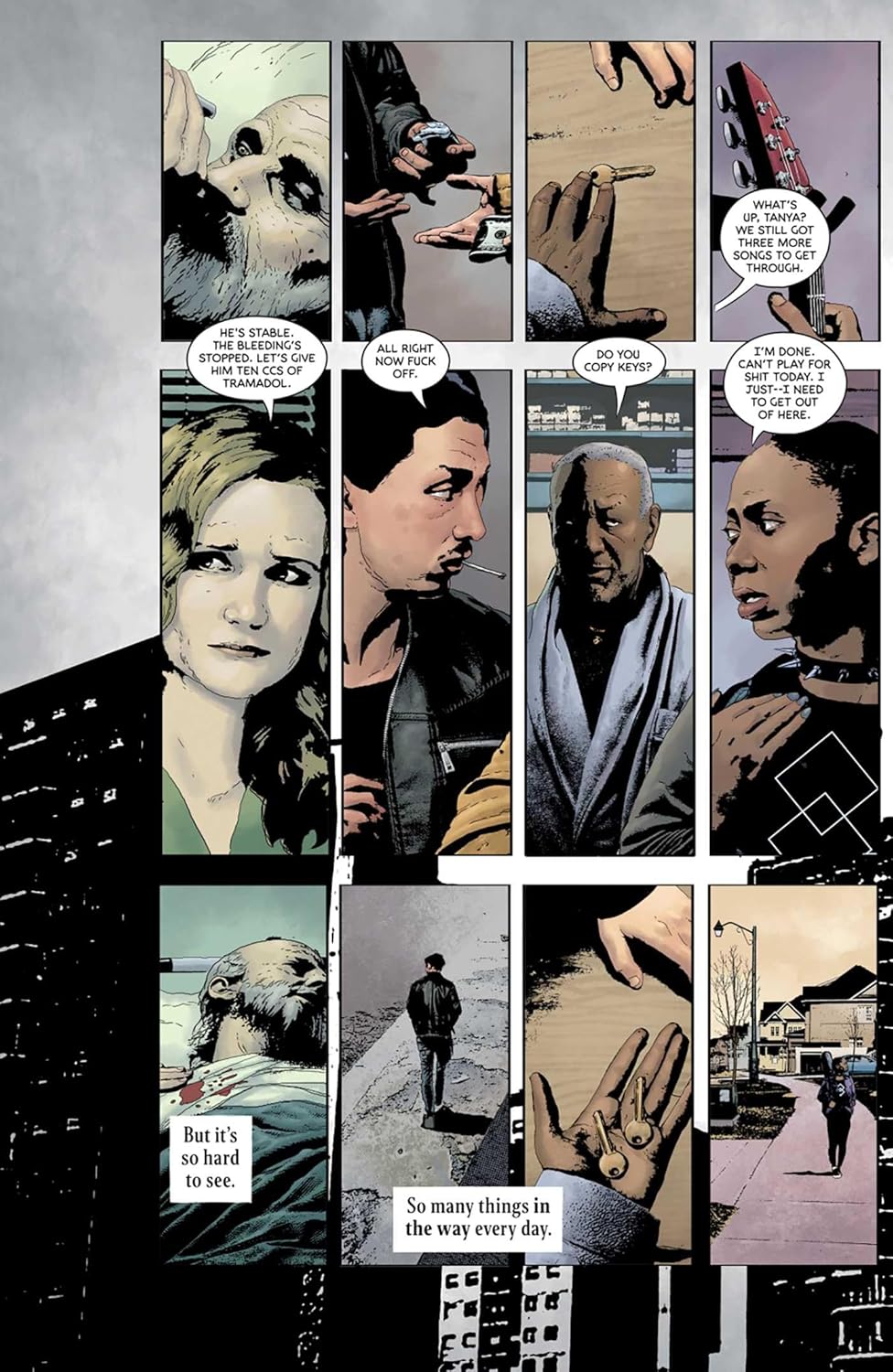 In TENEMENT, Jeff Lemire & Andrea Sorrentino bring you the story of seven residents of a building and the dark secrets that bind them together. It begins with a sinister death and leads the neighbors on a mind-melting and horrific journey to save their own lives and each other's. As they find their way home, the secrets of the Bone Orchard are finally revealed in this critical chapter that readers have been waiting for!