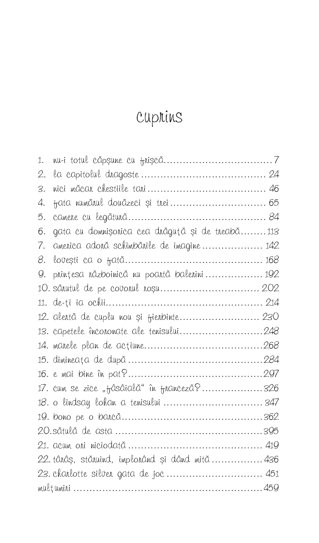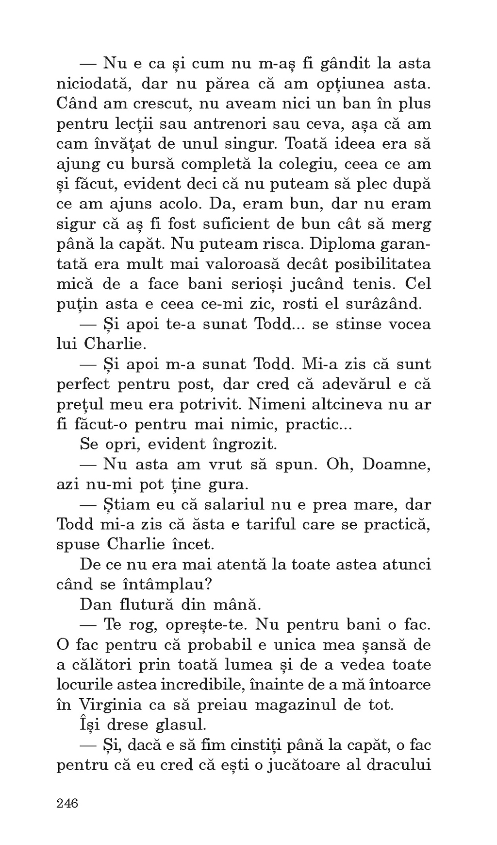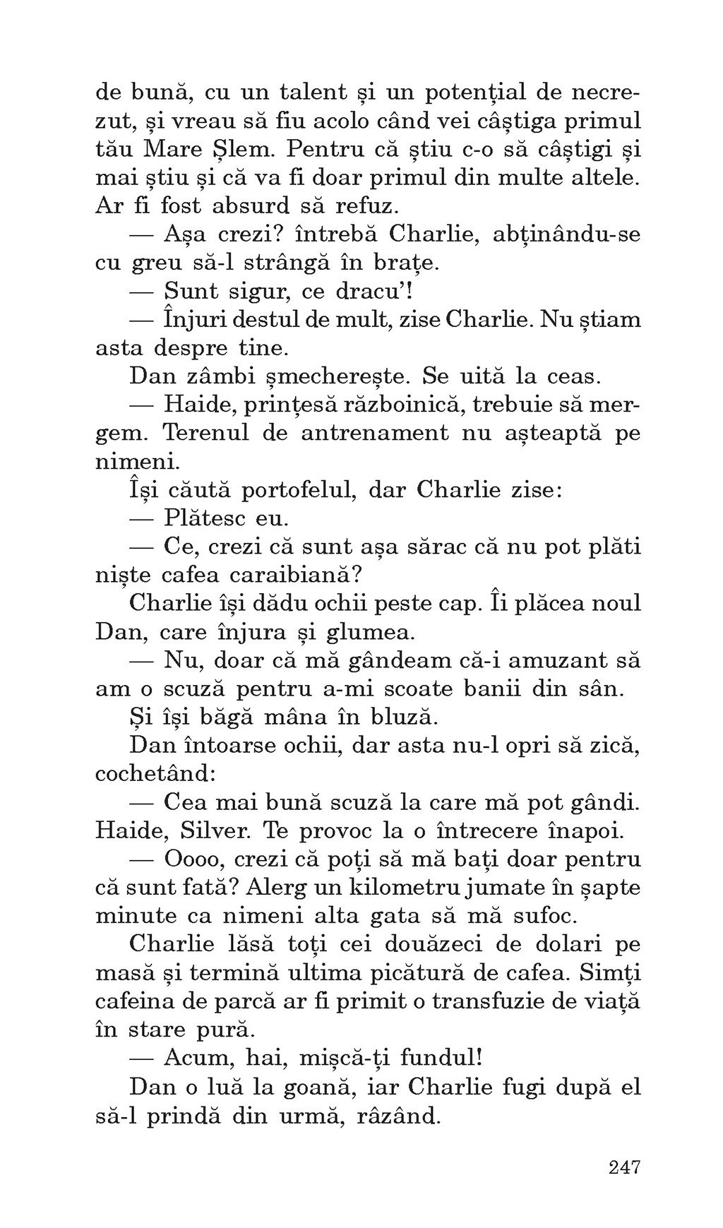 Charlotte „Charlie” Silver a fost dintotdeauna un copil cuminte. Se remarcă devreme în lumea tenisului, antrenată de tatăl ei, un jucător de primă clasă la rîndul lui, şi ajunge repede unul dintre juniorii de top. Cînd părăseşte universitatea pentru a intra în circuitul profesionist, Charlie pătrunde în lumea celor mai buni sportivi, concurînd fără milă pentru turnee internaţionale şi pentru paginile revistelor mondene. Ea zboară în jurul lumii, joacă meciuri caritabile la bordul iahturilor luxoase, păşeşte pe covorul roşu la petrecerile organizate pentru sportivi – toate astea în timp ce încearcă să-şi urmărească adevărata ţintă. În acest roman cuceritor despre viaţa starurilor din tenis care se antrenează fără oprire, într-o lume obsedată de postări pe Instagram, Charlie trebuie să descopere secretul de a împăca dorinţa de a învinge cu presiunile unei societăţi mereu în căutare de senzaţional.