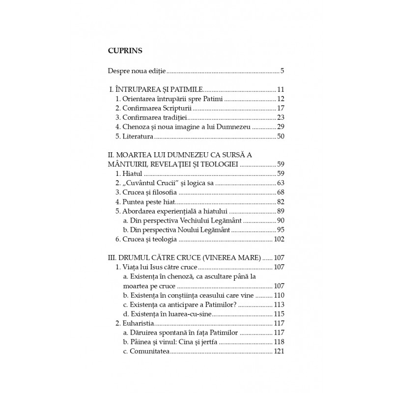 Printr-un dialog atent cu surse patristice, biblice şi mistice, autorul schițează o viziune dramatică şi radical pascală asupra economiei mântuirii - o teologie în care moartea nu este eludată, ci asumată în totalitatea ei de către Dumnezeu însuşi.