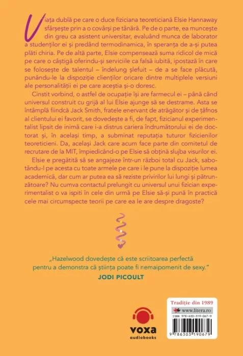 Cinstit vorbind, o astfel de ocupație își are farmecul ei – până când universul construit cu grijă al lui Elsie ajunge să se destrame. Asta se întâmplă fiindcă Jack Smith, fratele enervant de atrăgător și de țâfnos al clientului ei favorit, se dovedește a fi, de fapt, fizicianul experimentalist lipsit de inimă care i-a distrus cariera îndrumătorului ei de doctorat și, în același timp, a subminat reputația tuturor fizicienilor teoreticieni. Da, același Jack care acum face parte din comitetul de recrutare de la MIT, împiedicând-o pe Elsie să obțină slujba visurilor ei.